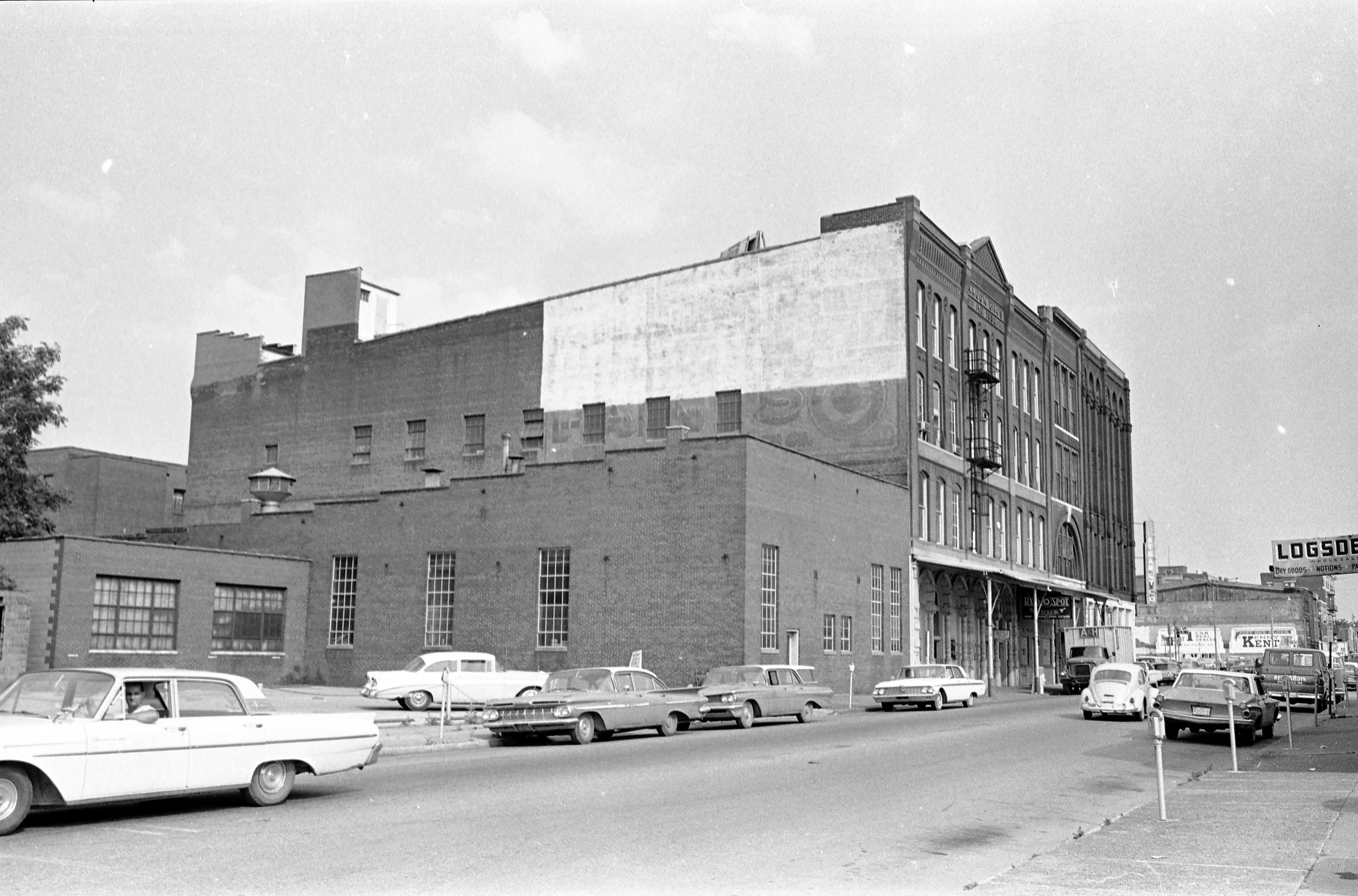 Red Spot Paint & Varnish Co. had several operations in this block, so it's unclear which one is pictured here. As to the Stearly Co. (restaurant equipment) sign on the corner (Vine St." the 1962 city directory gives this address as 201 NW 1st St., but the 1964 directory says this address is vacant. Logsden Wholesale was at 216-18 NW 1st St. (SEE MSS 228-0811 for the reverse view of this block).