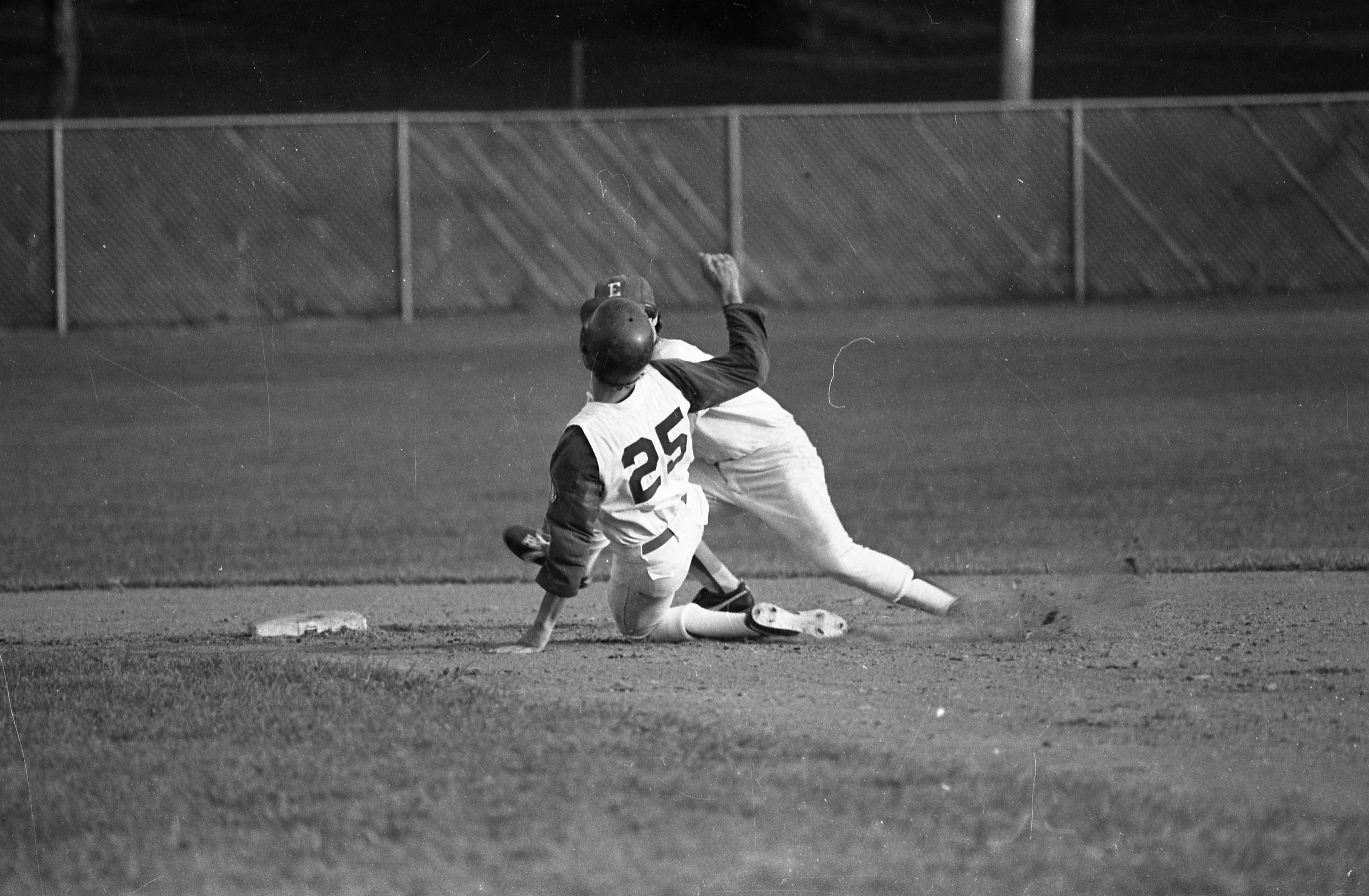 Baseman with a uniform that says Evansville prepares to tag no. 25 from the opposing team as he slides towards the base