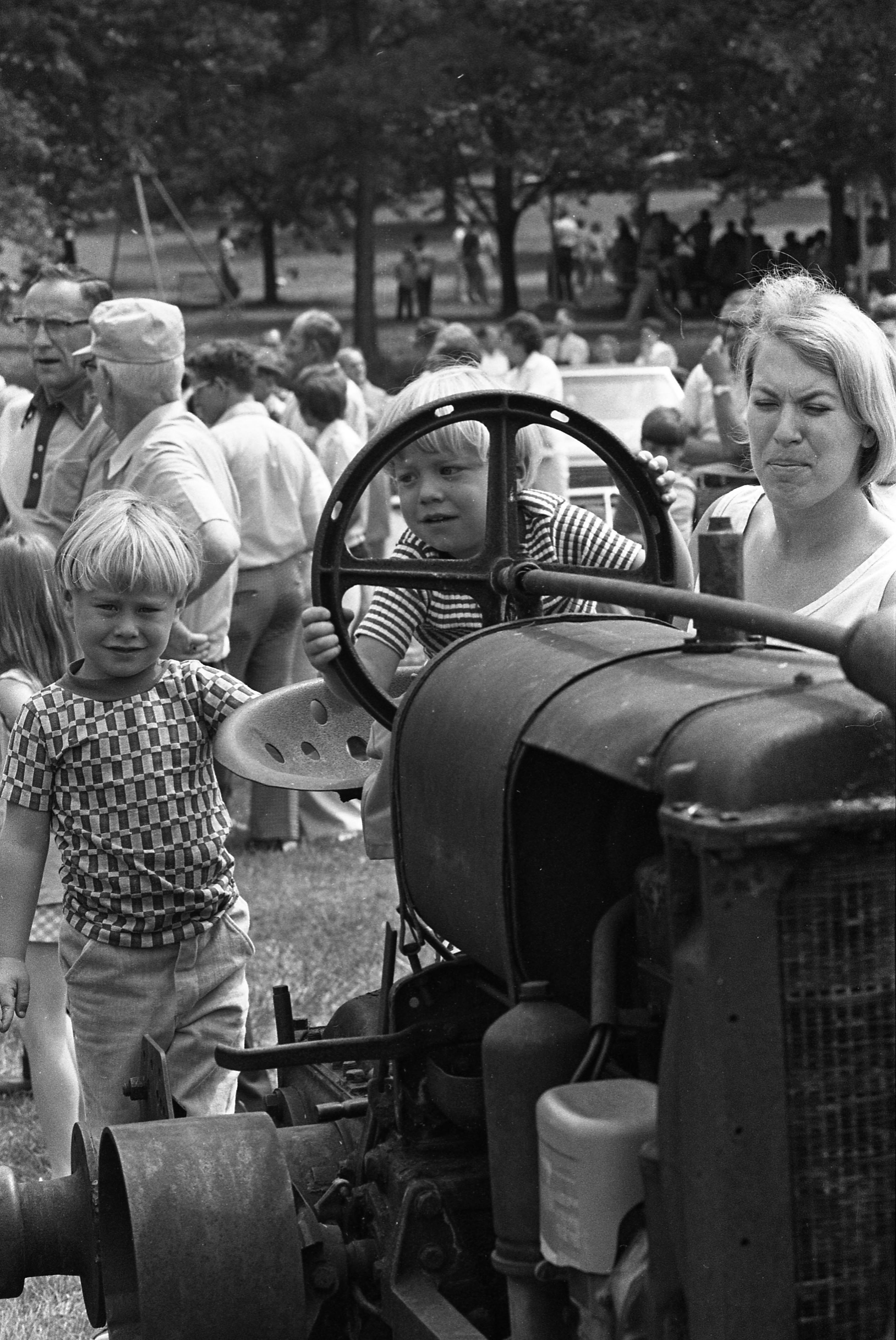 Little boys on a tractor with their mother at the Antique and Gas Engine Hoosier Show