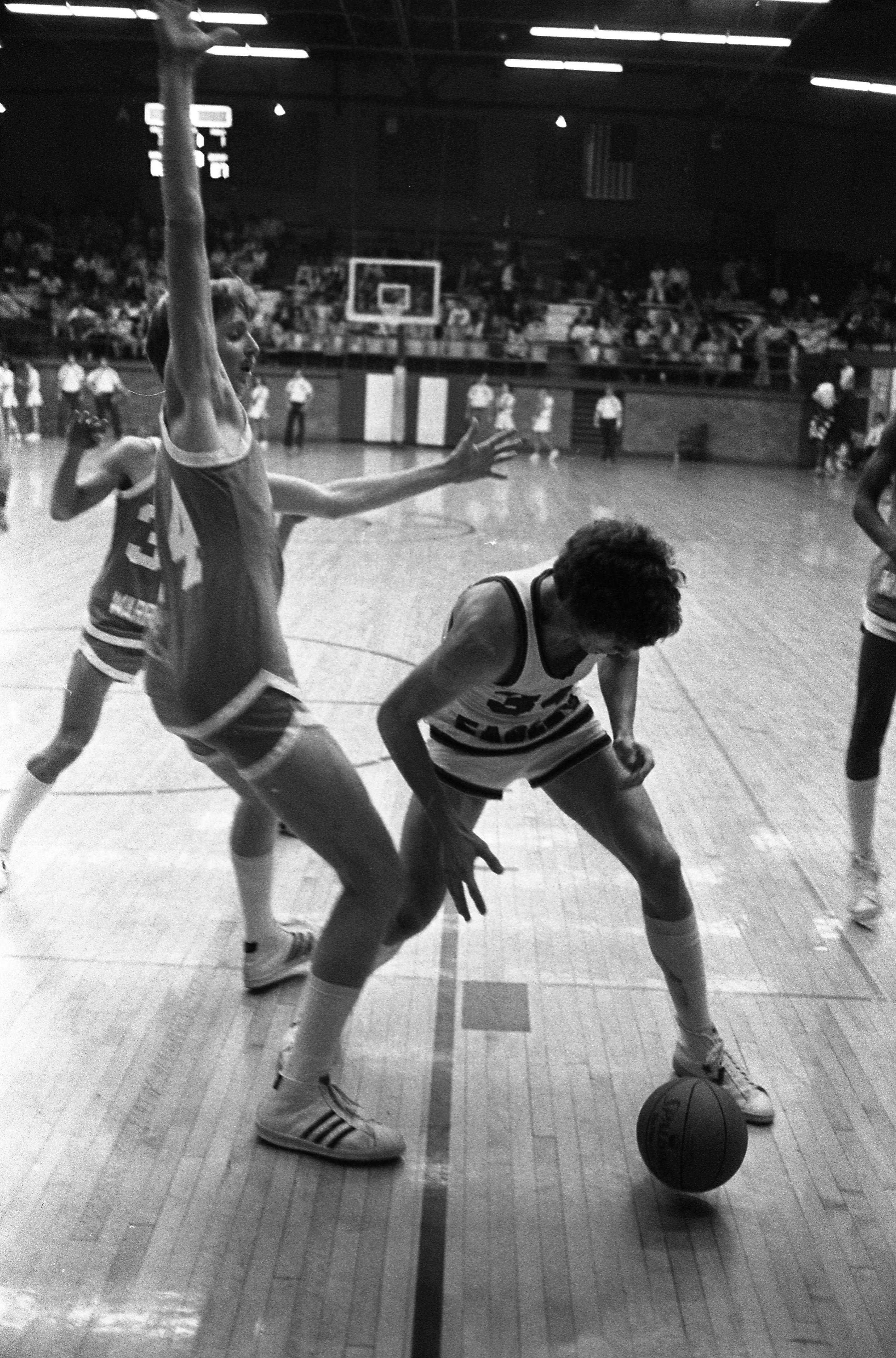 ISUE (Indiana State University Evansville, now USI/University of Southern Indiana) Eagles playing basketball against the Indiana Tech Warriors. ISUE won, 91-75. The 1979 ISUE yearbook identifies no. 34 as Rick Kissel.