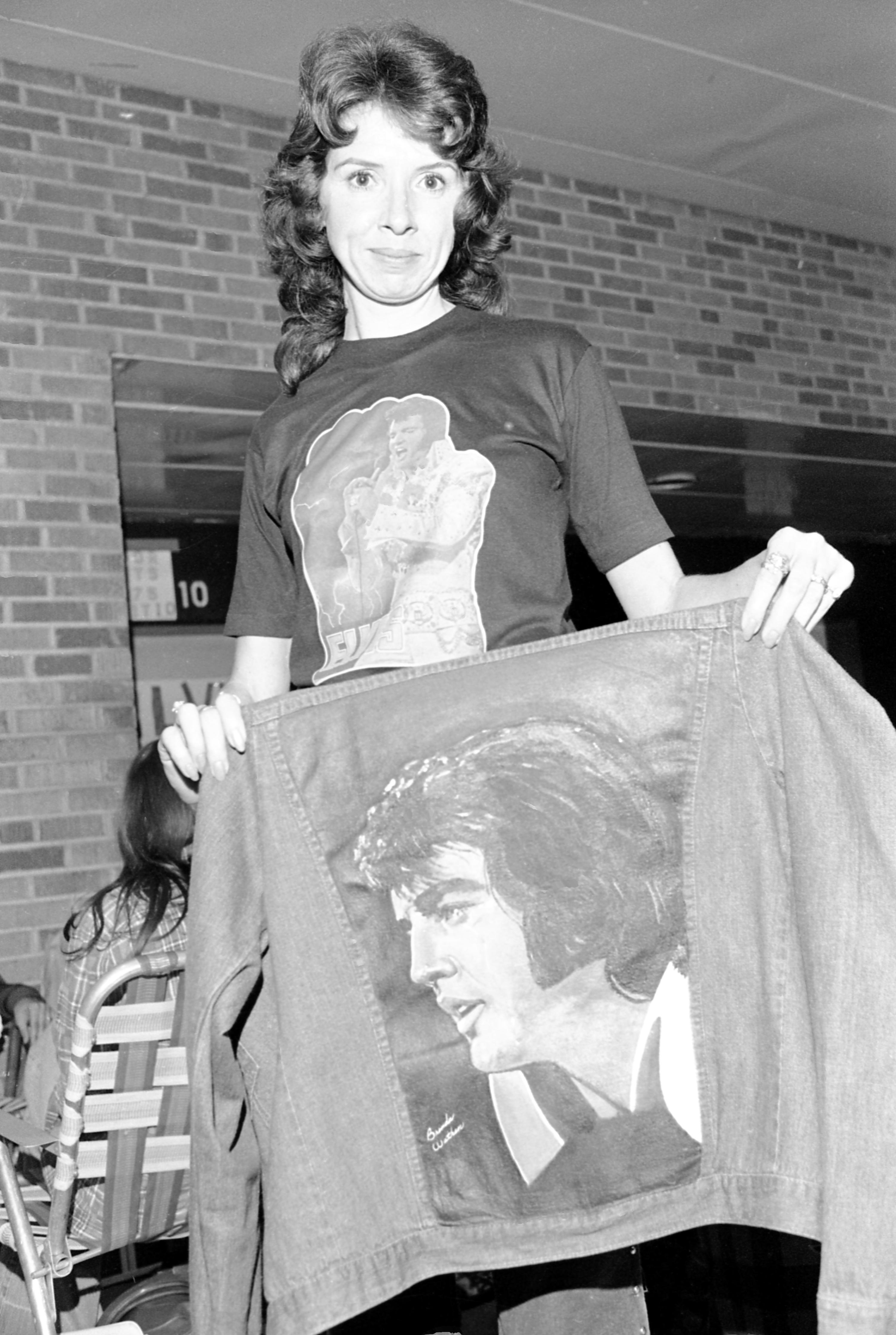 Woman wearing an Elvis t-shirt, showing off an Elvis jacket. She is at Roberts Municipal Stadium at 2600 Division St. Built in 1956, the stadium hosted concerts, circuses, basketball games, etc.; it was demolished in 2013. The concert itself was October 24, 1976.