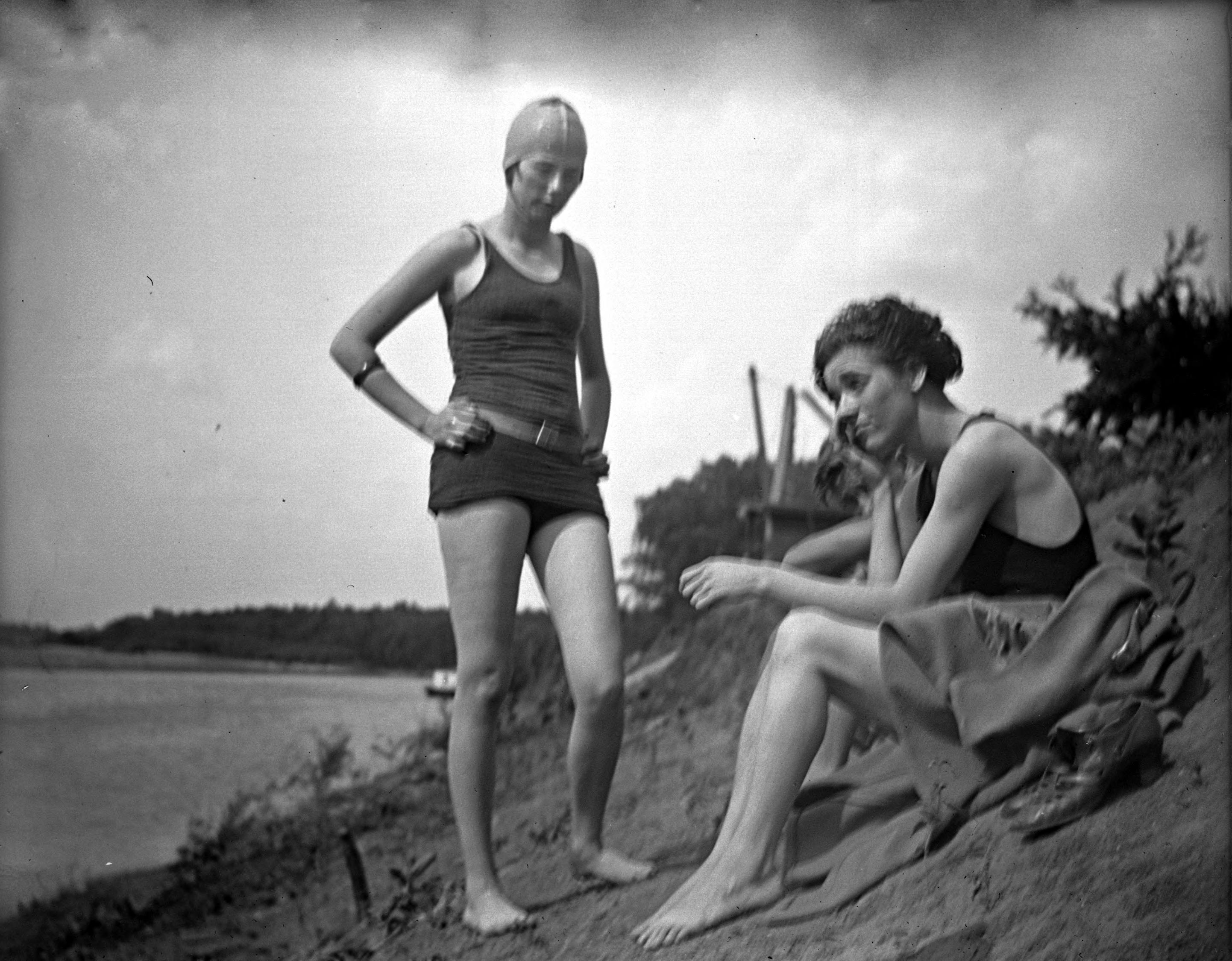 Octavia Griffith and Elsie Stephens in bathing suits, on the bank of the Wabash River.