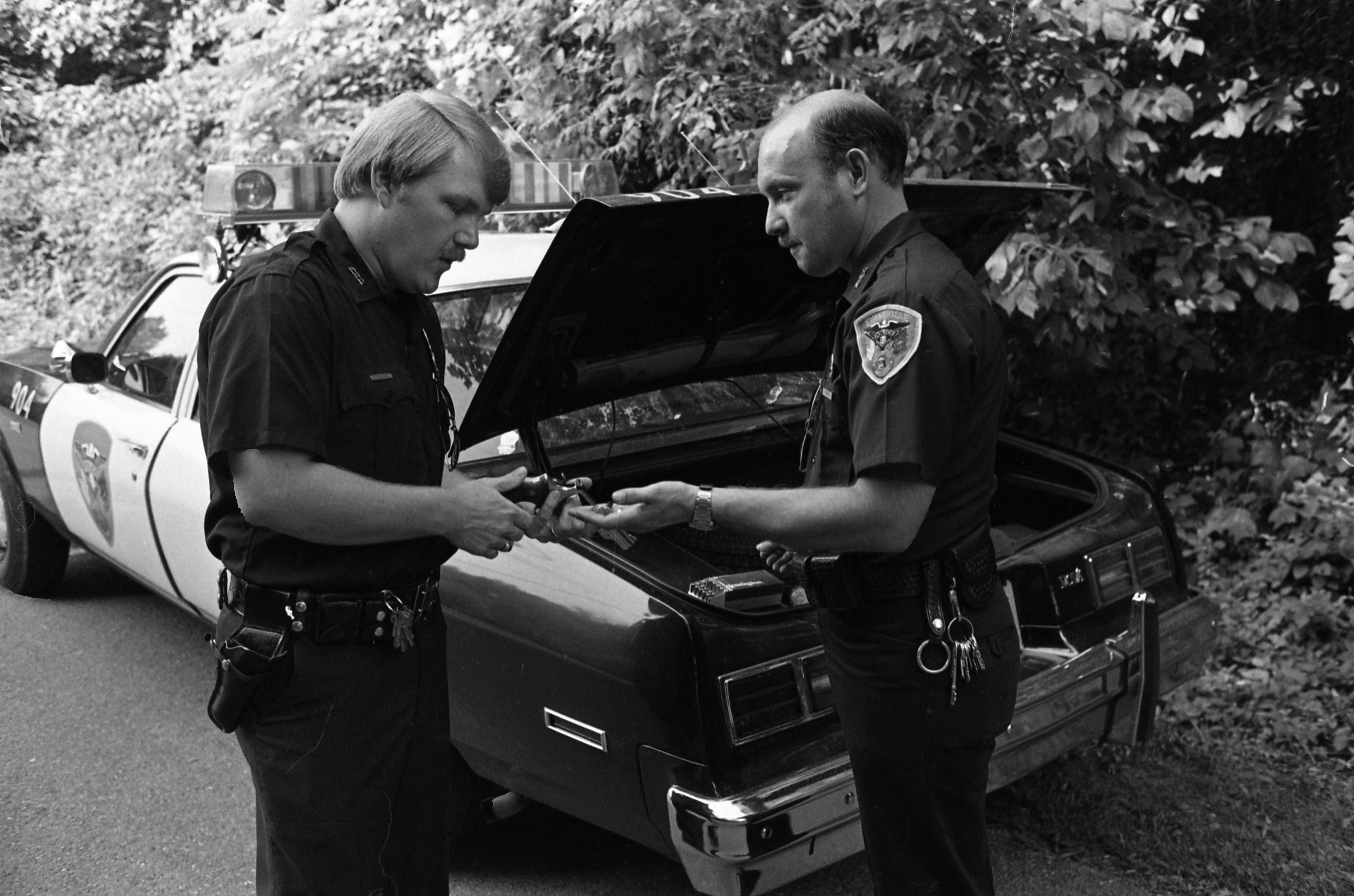 Two Evansville police officers, with the trunk of their cruiser (#904) open, stand nearby, one holding a weapon and the other, ammunition