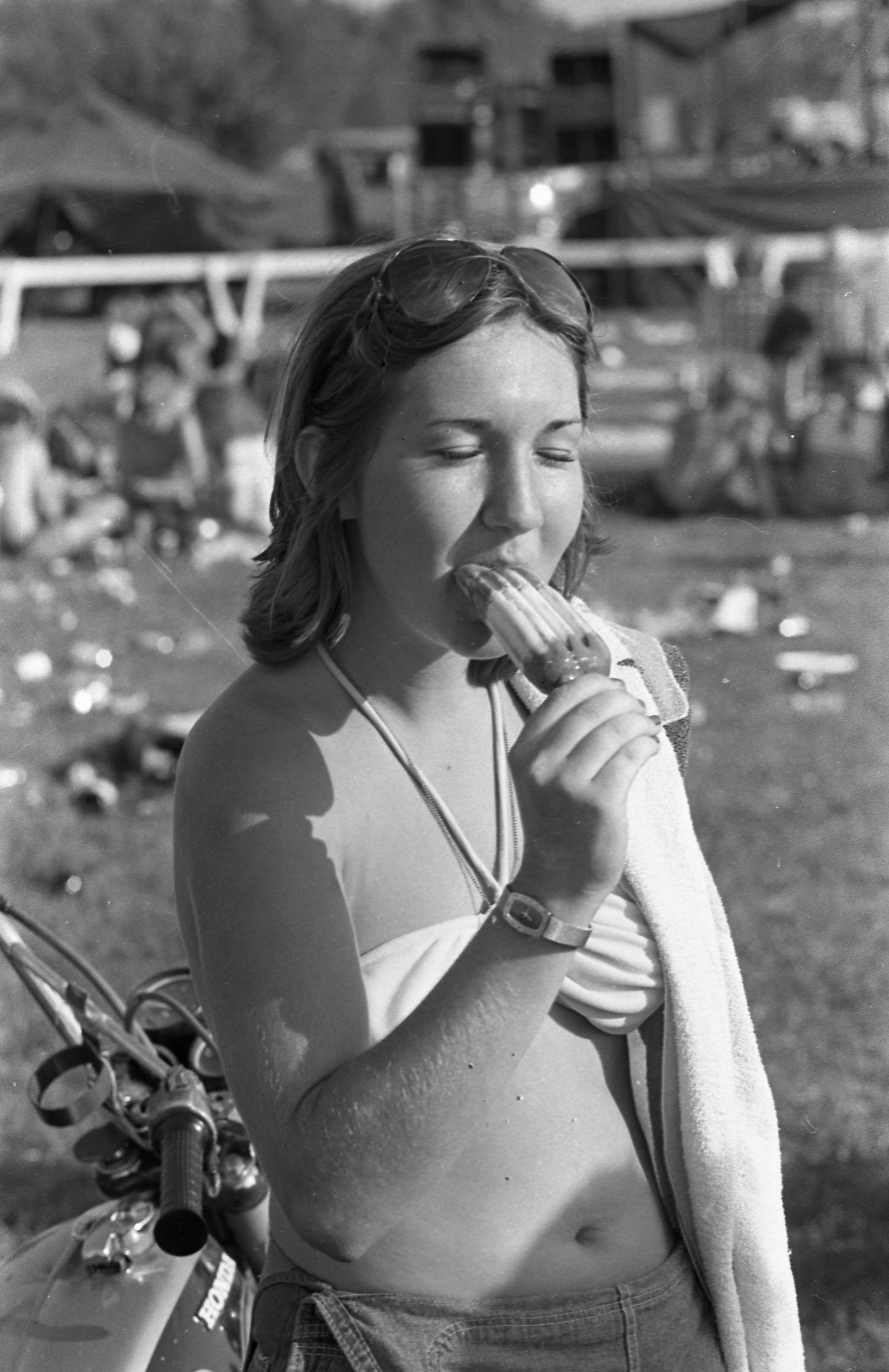 Girl enjoying a popsicle outside on a sunny day. What appears to be a Honda motorcycle is behind her.