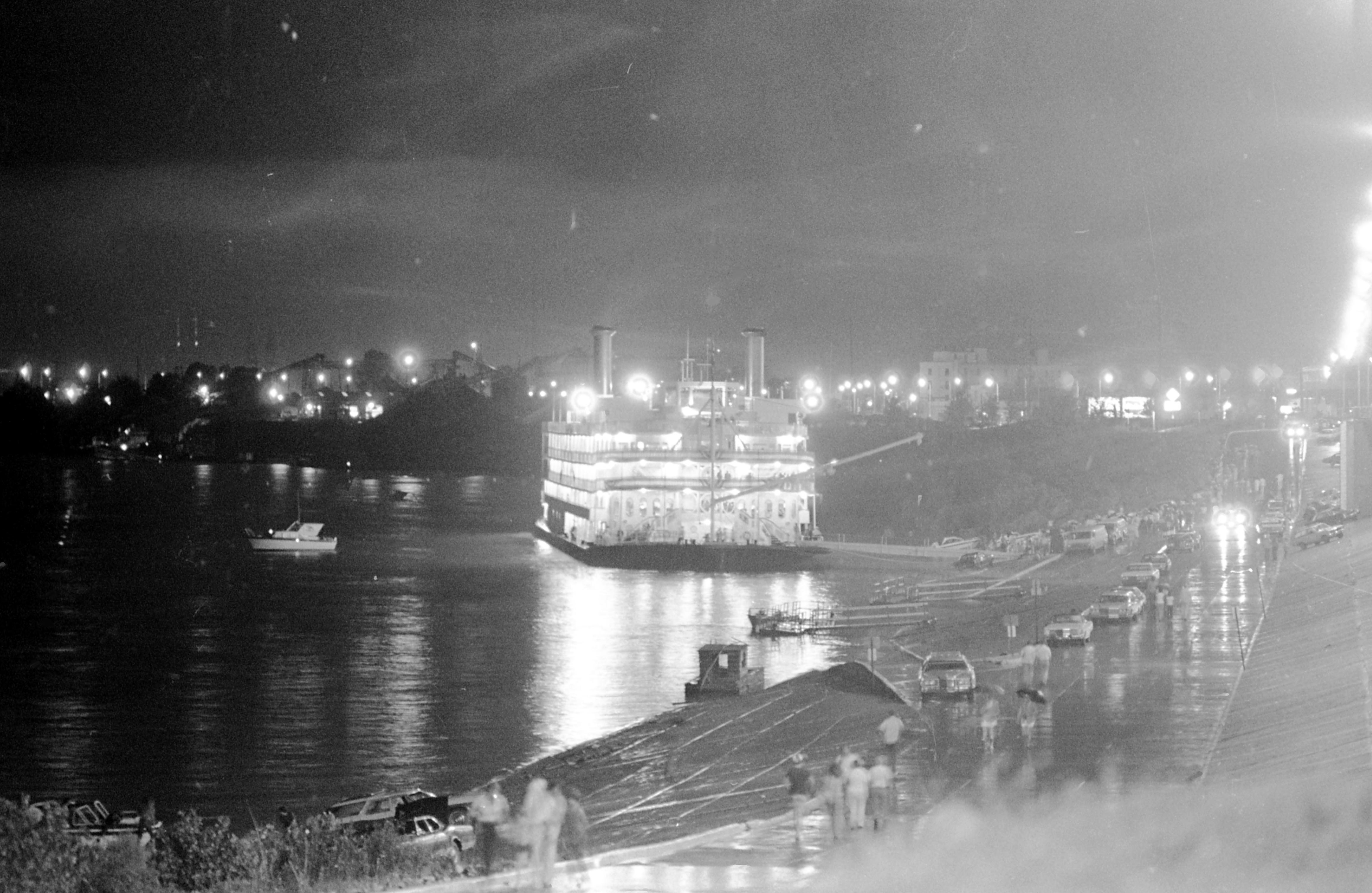 Rainy night time view of Mississippi Queen at Dress Plaza. The July 29, 1976 Evansville Press called it ""the palatial giant of the rivers." The $23.9 million, 379 foot long boat was to put in just long enough to take on water. (SEE ALSO MSS 034-0019)