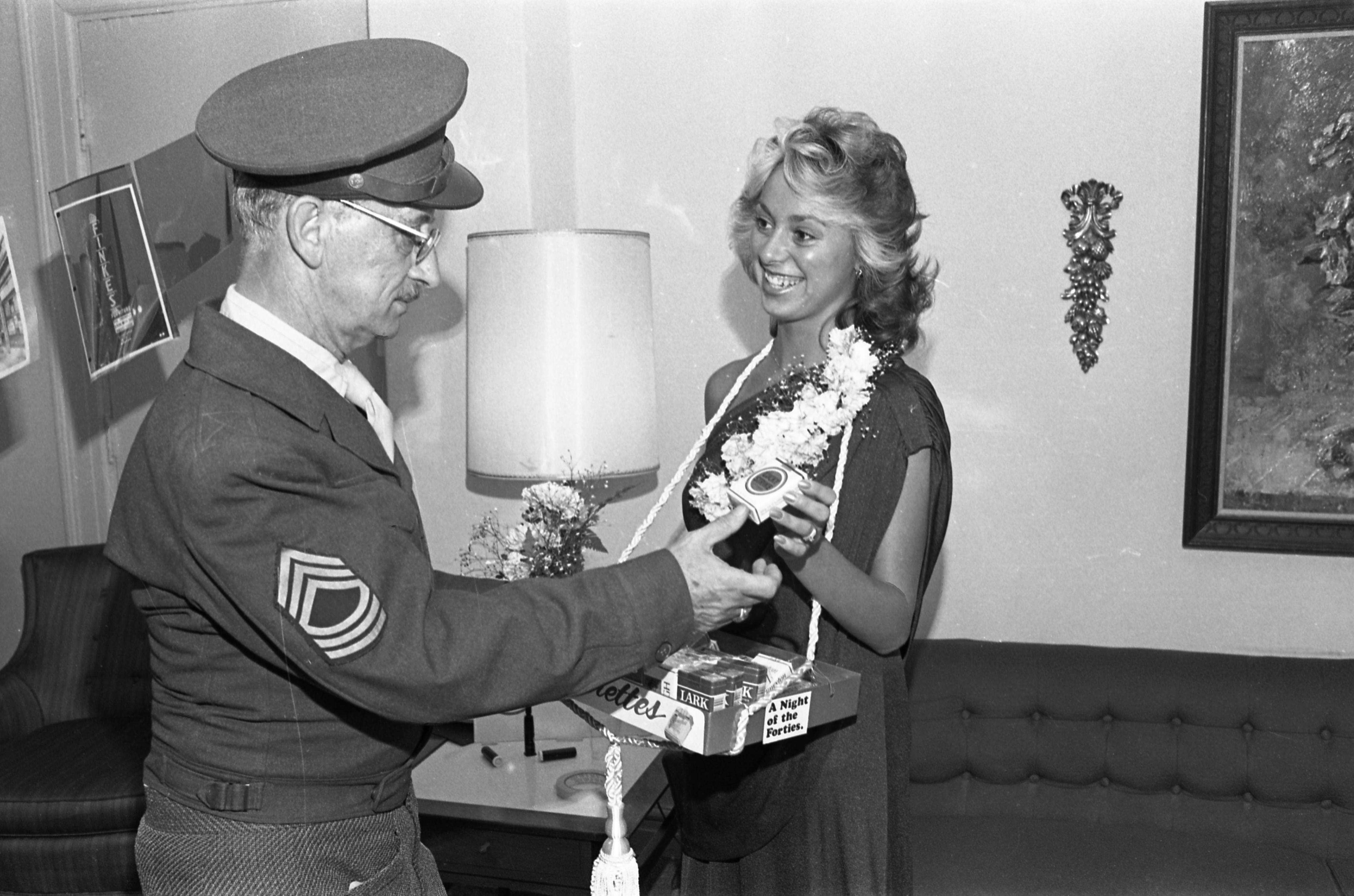At A Night of the Forties event, a woman posing as a cigarette girl sells Lucky Strikes to a man posing as a military officer