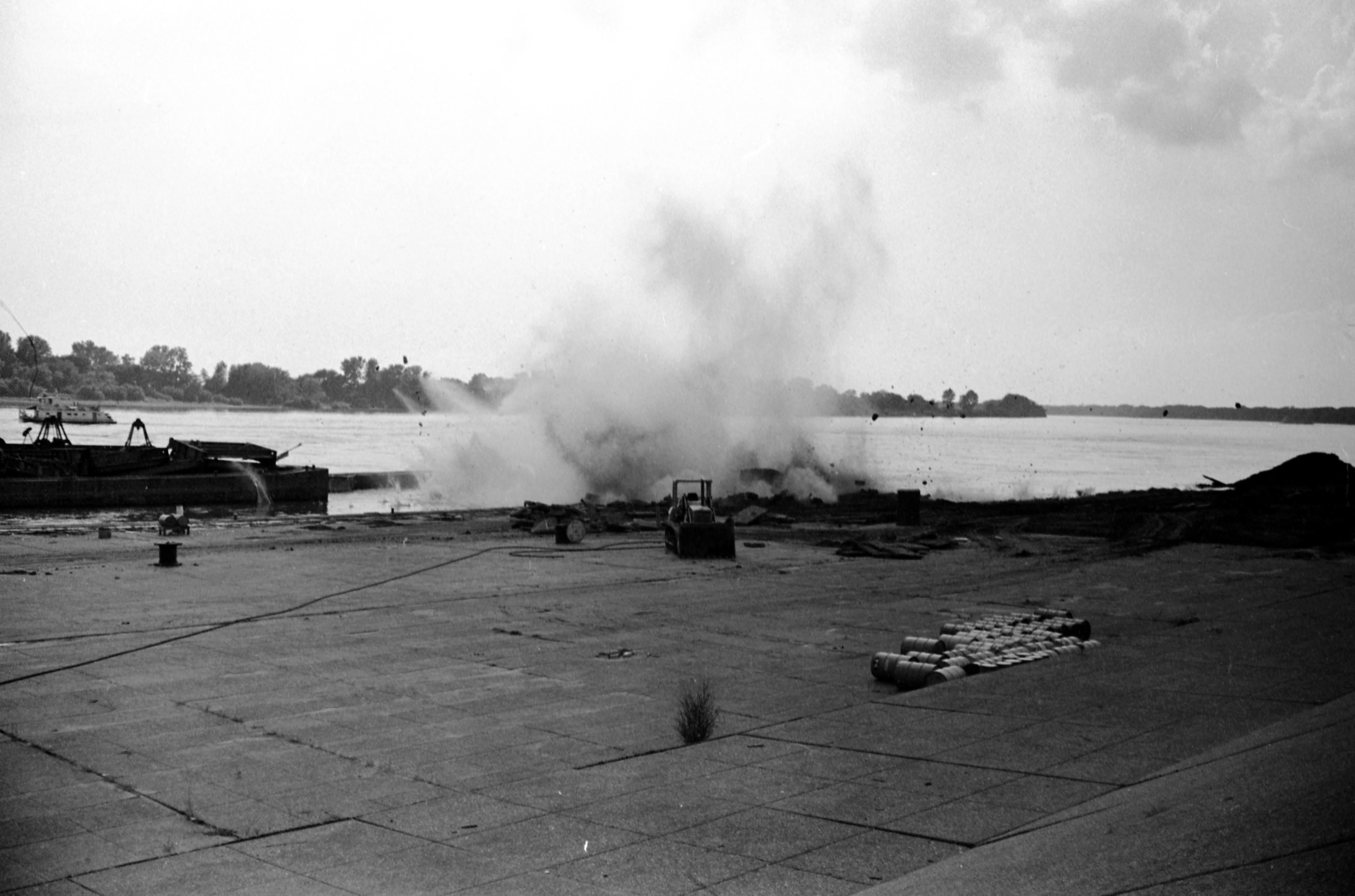 Demolition explosion at Dress Plaza, right by the river. There is a man driving a front-loader away from the explosion. There are barrels lying on their side a short distance away. A barge is on the river by the explosion, and a towboat is in the background.