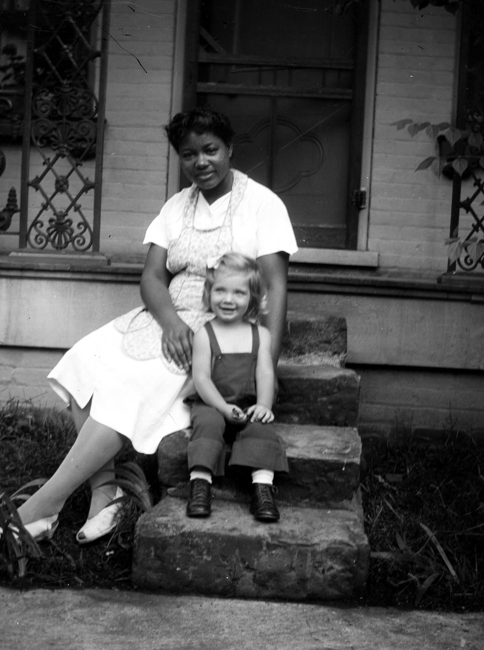 Jane Owen and nanny, sitting on the porch steps. Jane is the great-great-great granddaughter of Robert Owen,""the Welsh social reformer and owner of the celebrated textile mills in New Lanark, Scotland. Robert Owen purchased the town of New Harmony in 1825, creating a Utopian community in the hope of bringing educational, and social opportunities to every man, woman and child." (http://www.nytimes.com/2002/05/02/classified/paid-notice-deaths-owen-kenneth-dale.html_).