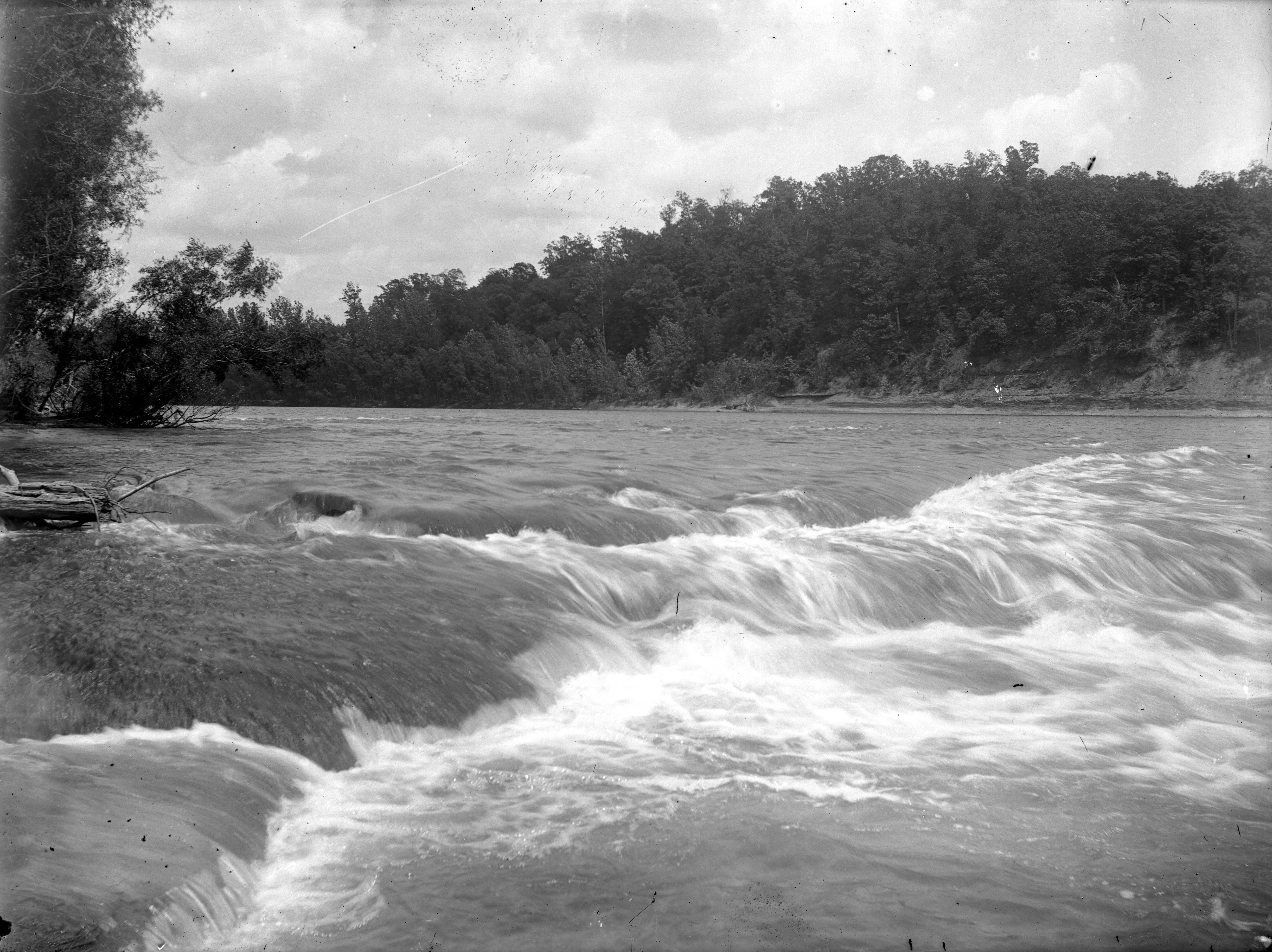 Old dam showing rough water---""The Old Dam is a group of natural rock formations rising from the bed of the Wabash River near New Harmony. When the Wabash is low in Summer, the rocks emerge forming a series of rapids, pools, and waterfalls." (http://visitposeycounty.com/the-old-dam/).