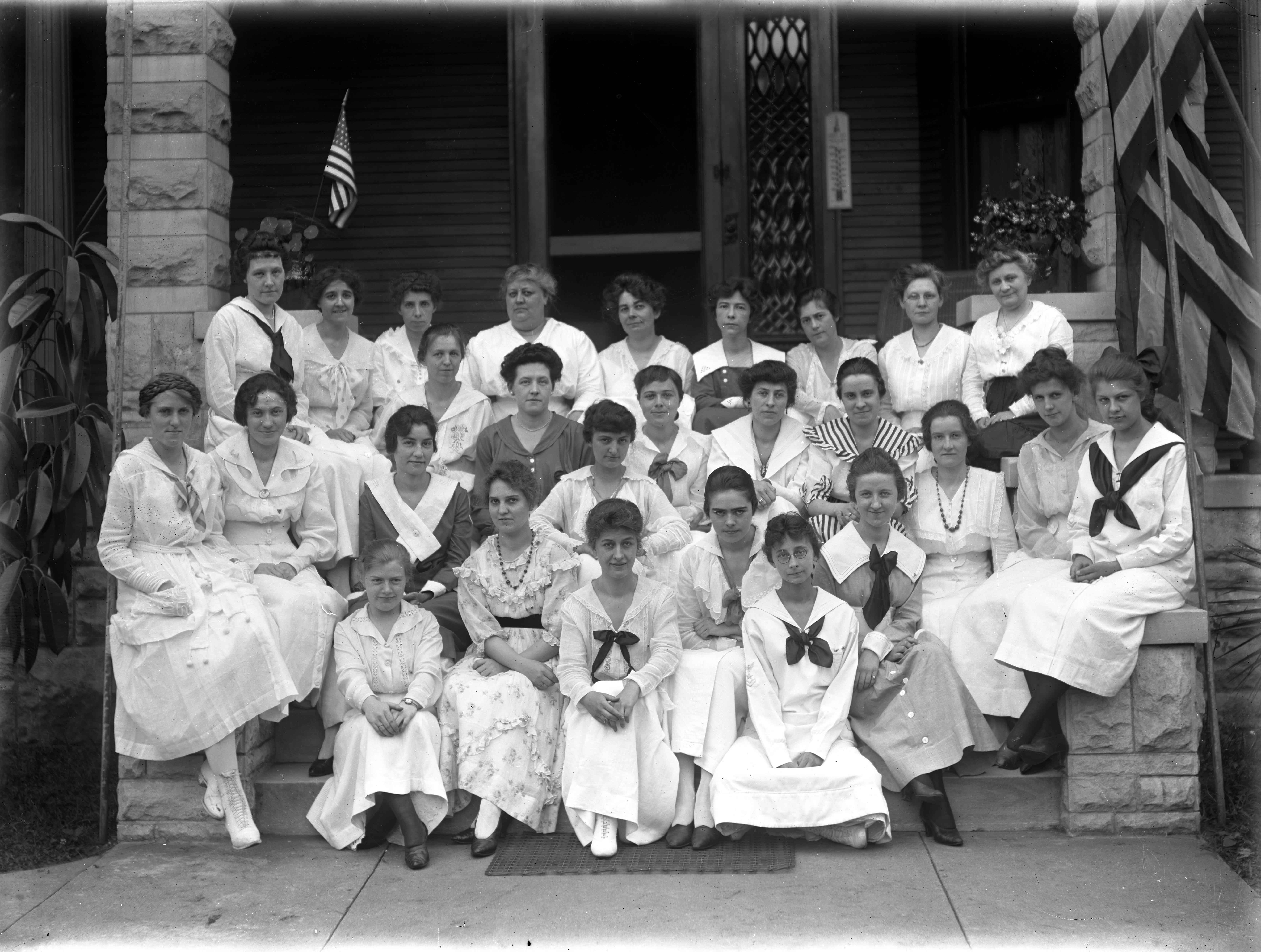 Twenty seven women, most of the same approximate age, sitting on the front steps of a large house, with an American flag on the right and a smaller one on the porch. Jessie Thomas is identified as 3rd from left, back row. Tillie Lichtenberger is also in this photo, and from other photographs seen, she is believed to be 4th from left, back row. One of the other women is said to be Millie Cox, but no specific woman identified with that name.
