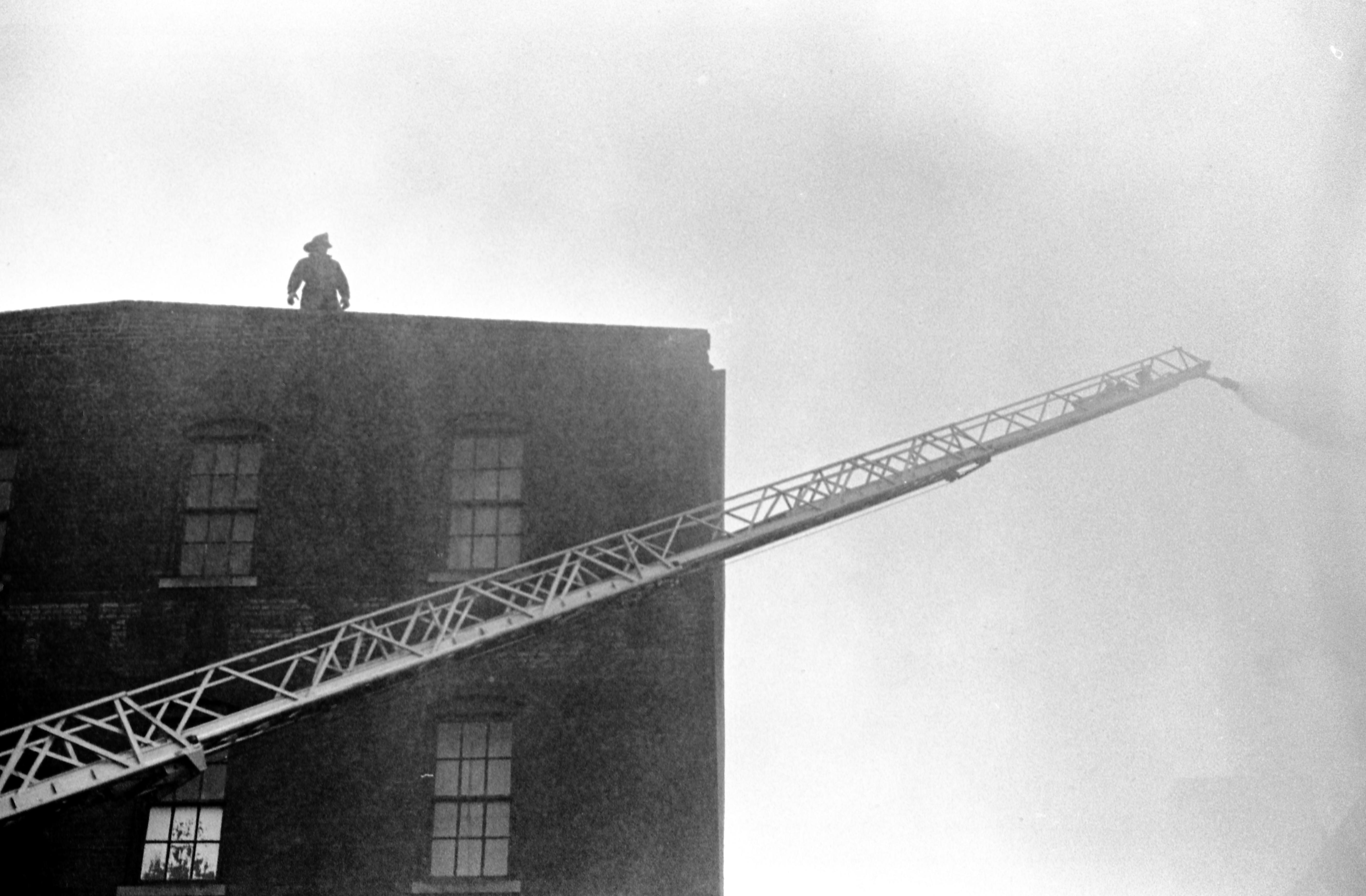 Fireman atop a building, looking down at a crane spraying water at Universal Furniture Co., 1419 Pennsylvania St., building on fire