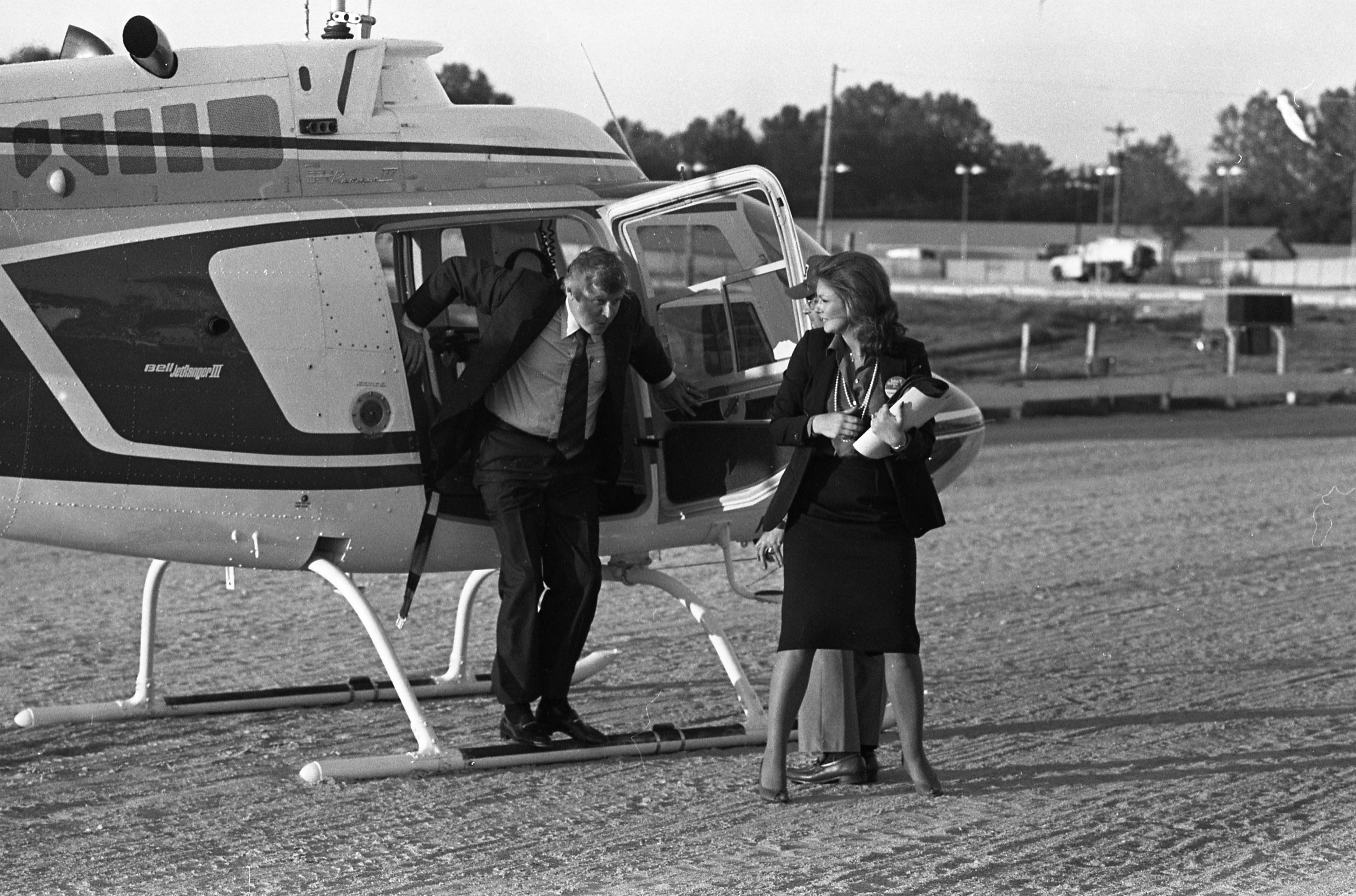 John Y. Brown, Jr., Democratic gubernatorial candidate (Kentucky) and wife, Phyllis George Brown, on a campaign visit, here alighting from a helicopter