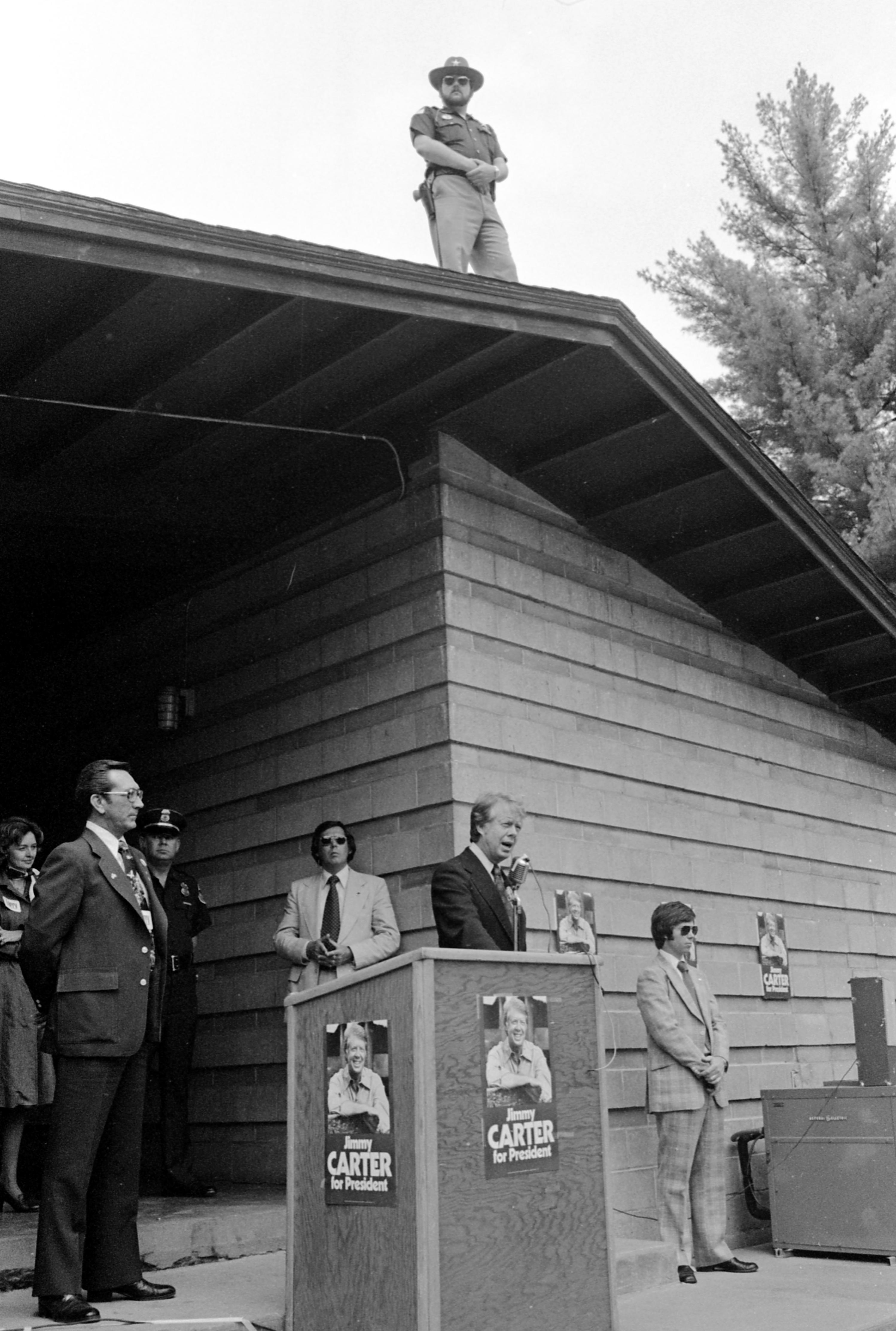 Jimmy Carter on the U.S. presidential campaign trail, looking up at a sheriff's deputy on the roof of the building Carter is speaking by