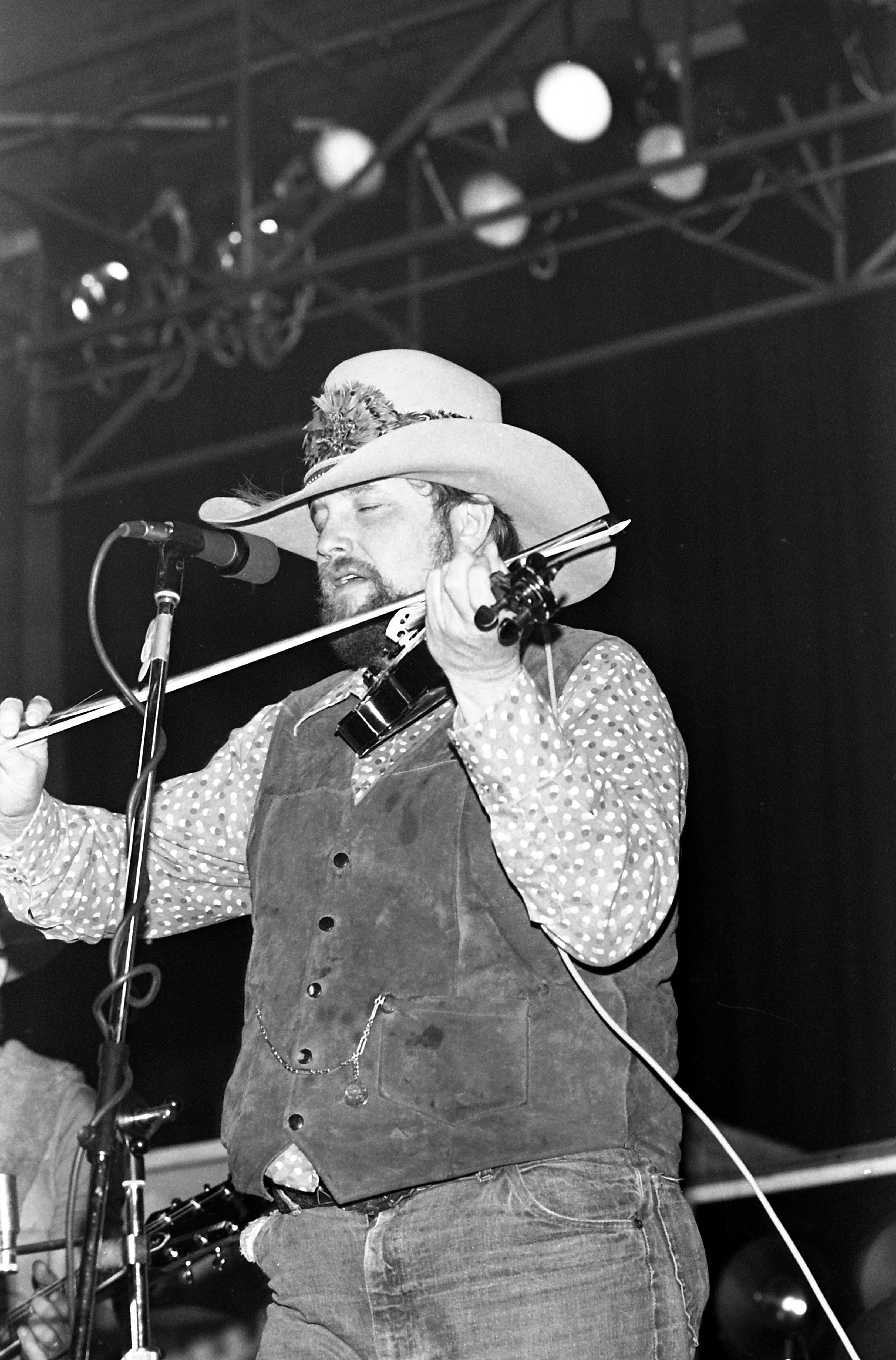 Charlie Daniels in concert at the Soldiers and Sailors Memorial Coliseum ( 350 Court St.", playing his fiddle at a microphone