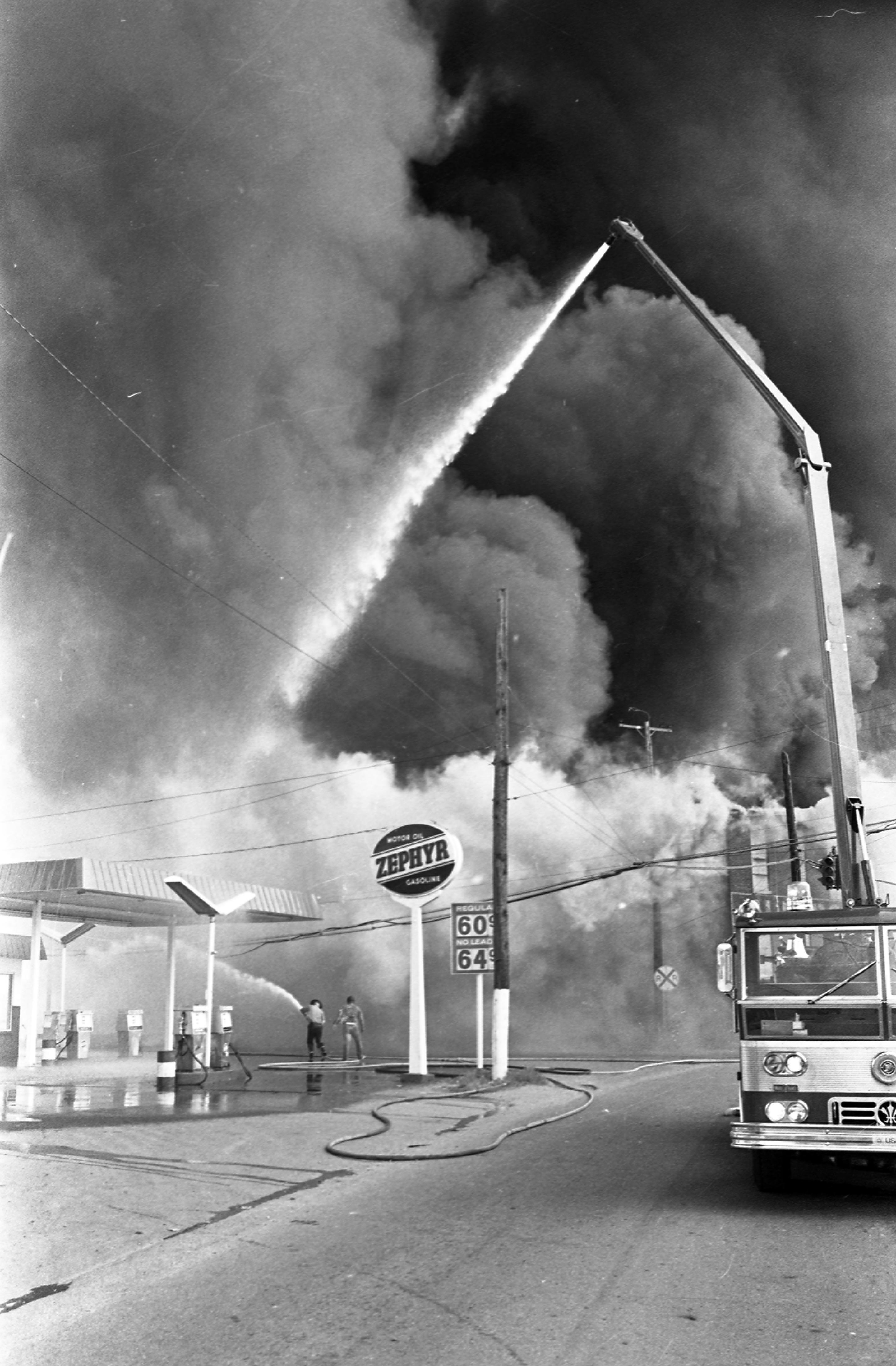 This fire began in the Atlas Tack building at the corner of O'Byrne and Atkinson St." then was blown across O'Byrne St. into an open field full of tires, and from there debris from the tires blew it back into warehouses at the corner of Clay and Atkinson St.. It was feared it would spread across Clay St. to this Zephyr gasoline station, but fortunately that did not happen. Here a firetruck is using its ladder to spray water down from above.