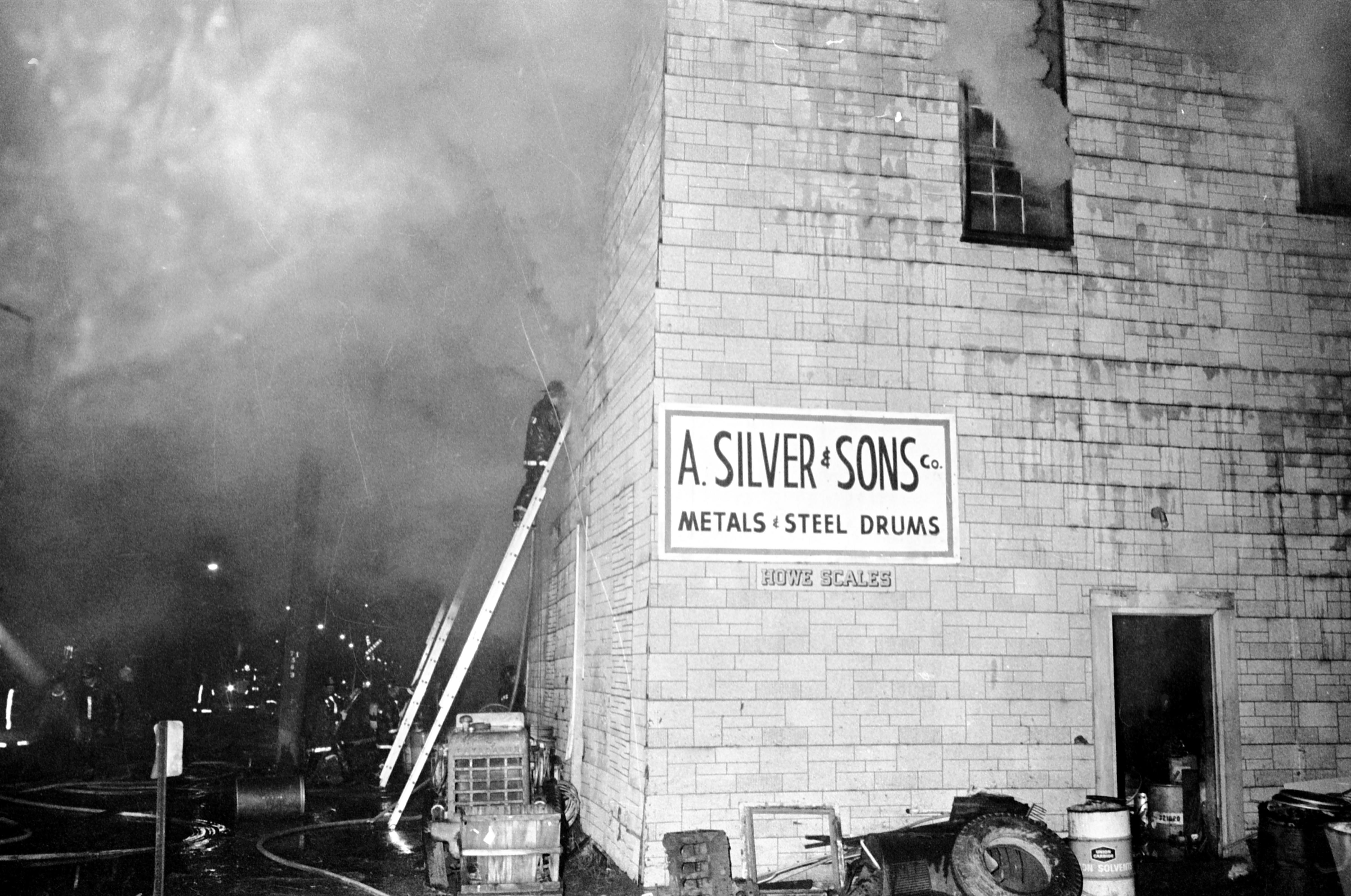 Corner of A. Silver & Sons Co. at 1801-27 W. Maryland St., dealer in scrap iron and metal, barrels and drums, on fire, with fireman on ladder