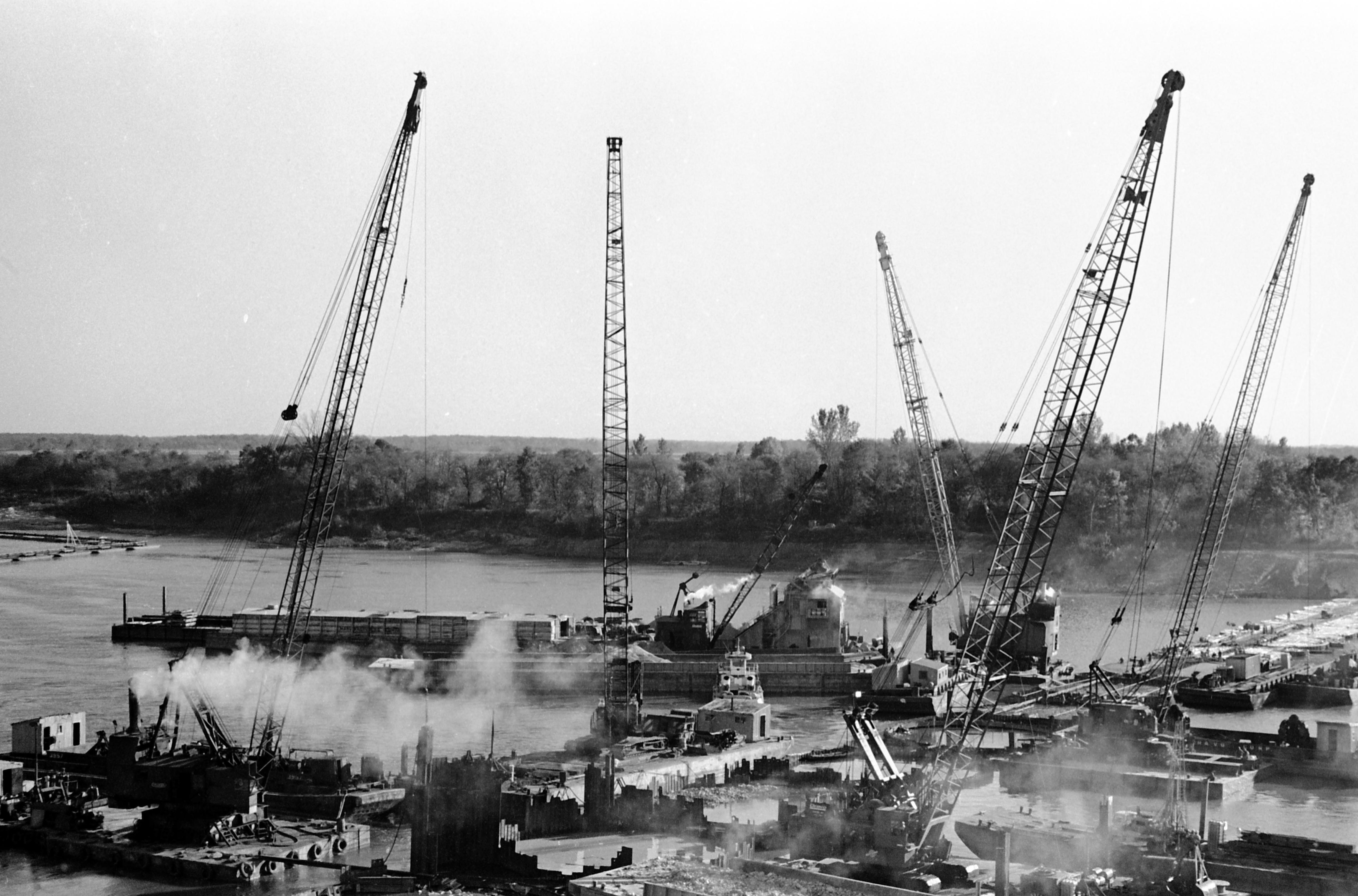 Construction of dam at Newburgh. According to the U.S. Army Corps of Engineers, construction on this dam began in June 1970 and was completed in 1975. The locks were built first, beginning in June 1966 and placed into operation in December 1969. Statistics on the dam: Type: Concrete fixed weir with tainter gate; Length: 2,275'; Upper pool: 358'; Lower pool: 342'; Number of gates: 9; Height of gates: 32'; Width of gates: 110'