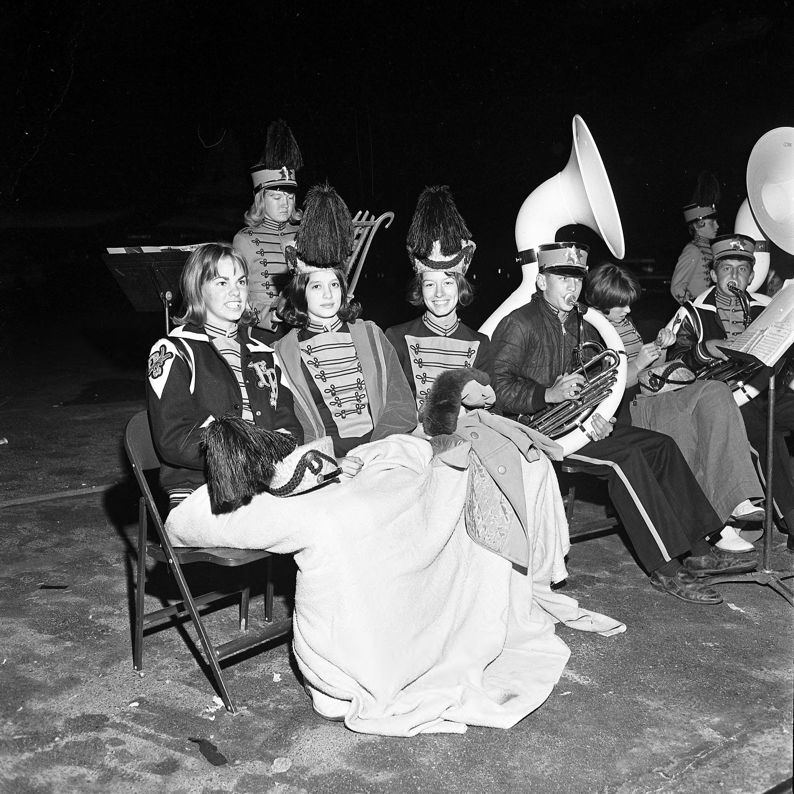 Members of the Ft. Branch High School marching band at Dress Memorial Airport, wrapped up against the cold weather as they awaiting the arrival of Vice President Hubert Humphey. He was to be in town to support the relection of Winfield Denton to the U.S. Congress. Denton represented Indiana's 8th district from 1955-1966.