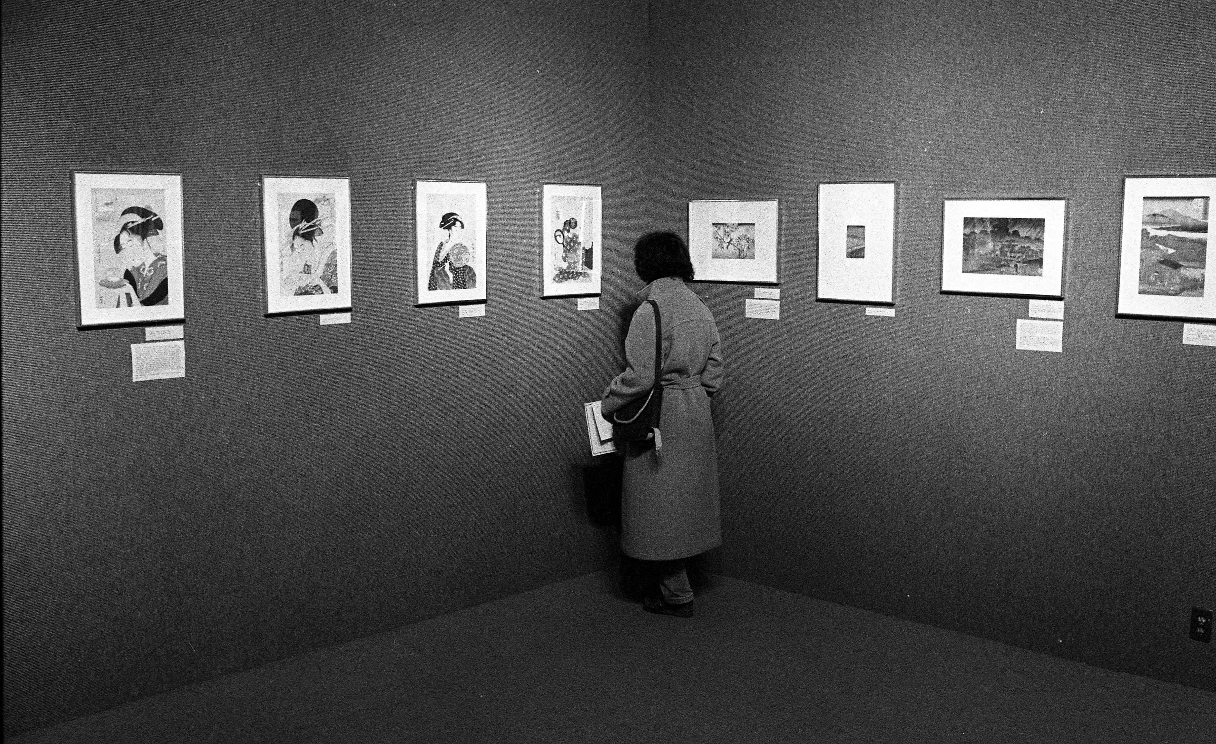 Woman looking at an exhibit of 18th and 19th century Japanese woodblock prints at the Evansville Museum of Arts and Science at 411 SE Riverside Dr.