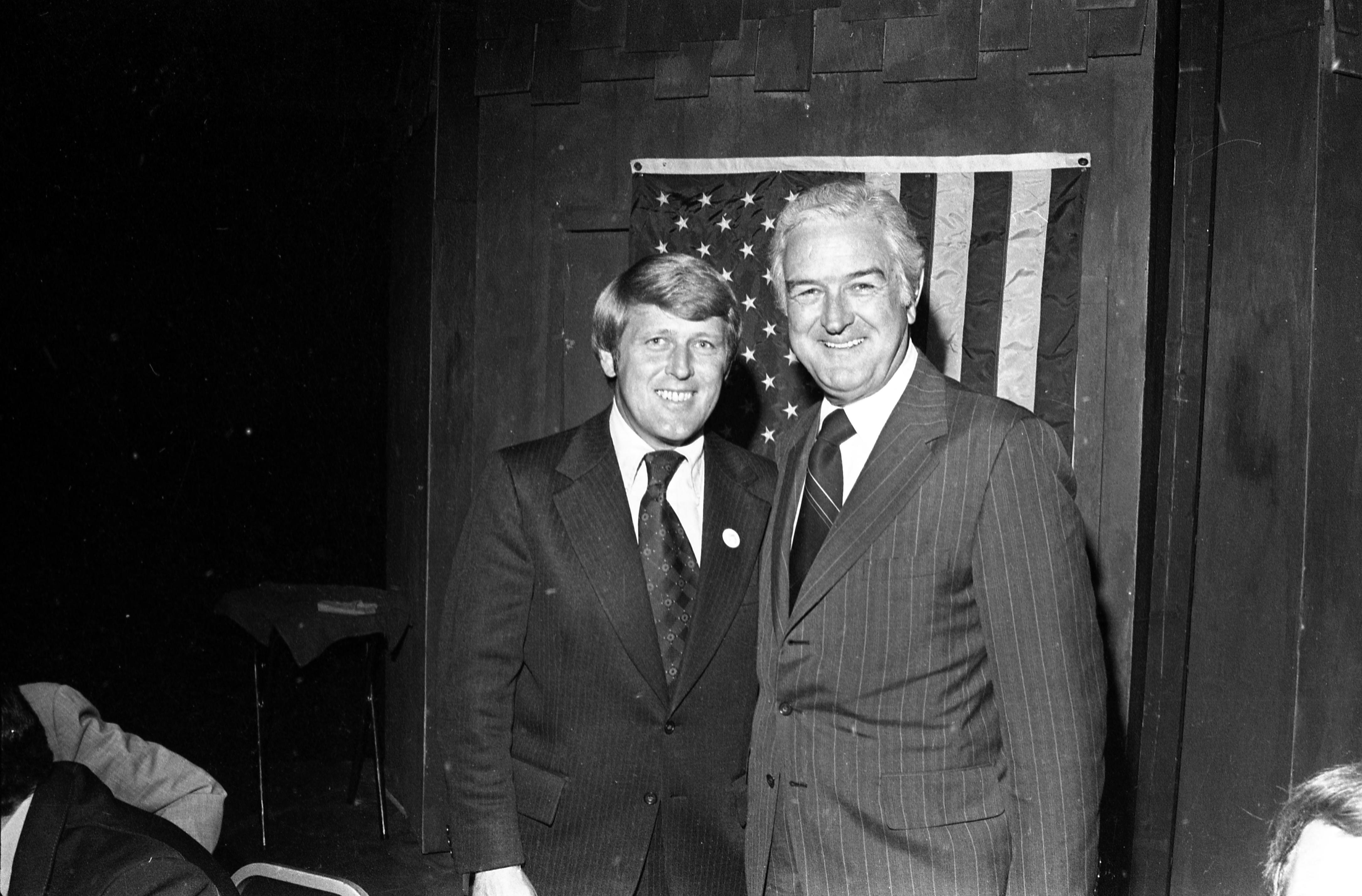 Former Secretary of the Treasury John Connally spoke at a fundraiser for U.S. Representative (Indiana, 8th district) candidate, Belden Bell. The luncheon was held at the Upstage Dinner Theatre, 100 SE 1st St. Here, Connally poses with Evansville Mayor Russell G. Lloyd, Sr.