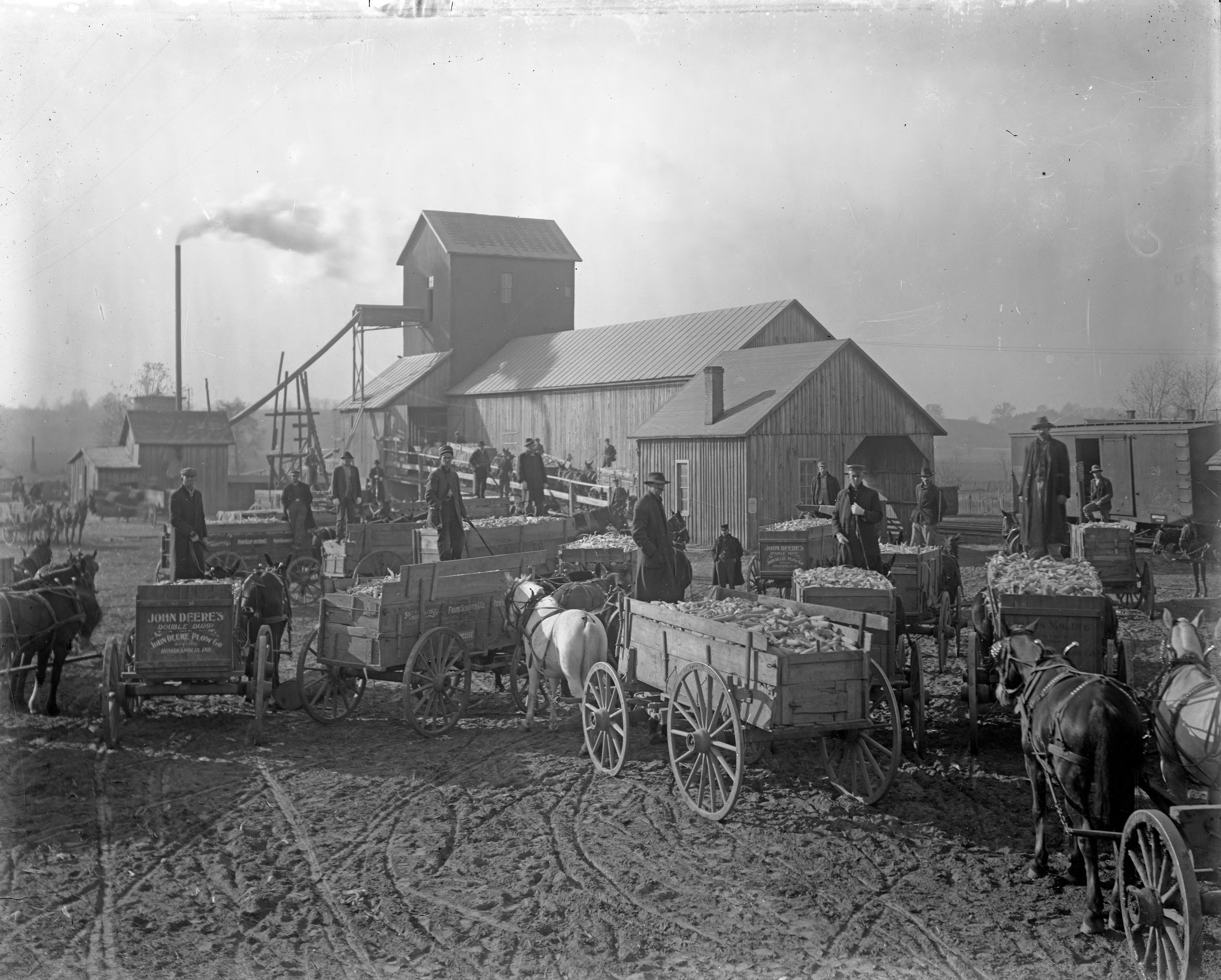 Grain mill, with line of horses and wagons filled with corn ") waiting to be unloaded.