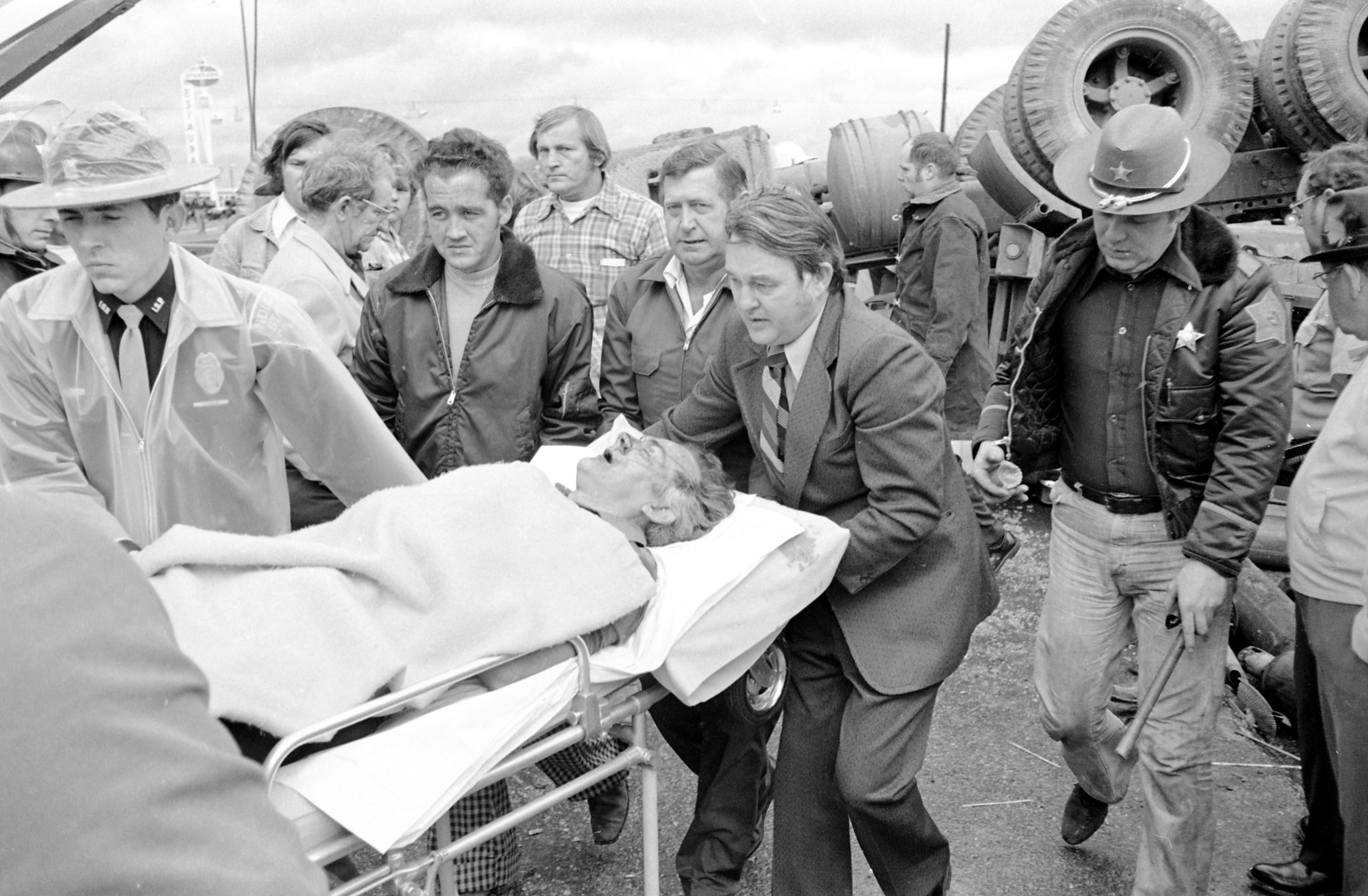 Indiana State Police officer and sheriff's deputy and others escorting the semi-accident victim as the gurney is being pushed, presumably to the ambulance