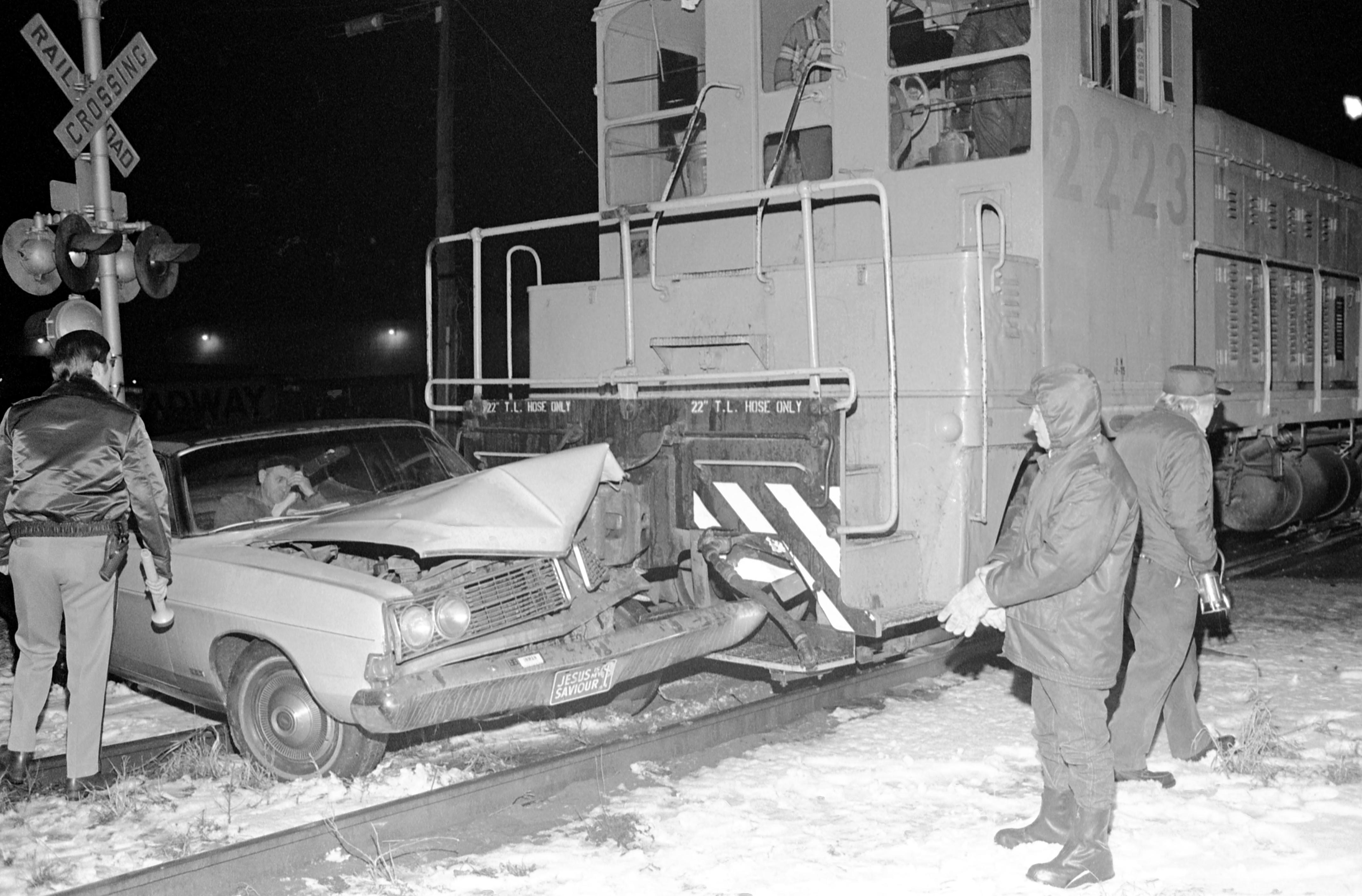Car hit by freight train at a crossing, with law enforcement and train officials nearby. The driver is still in the car, but looks to be not badly hurt.