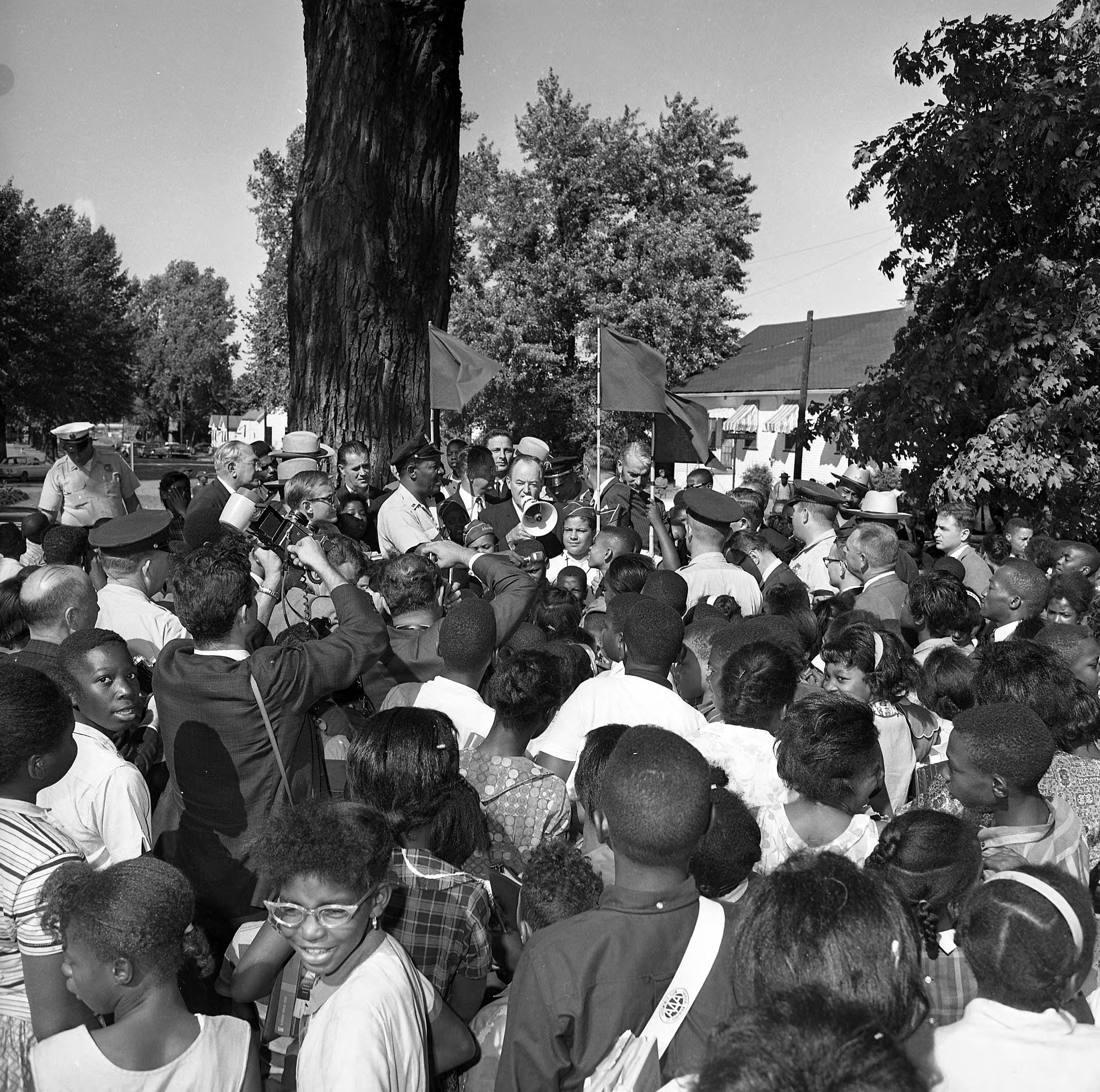 In 1964 then Senator Hubert Humphrey was in Evansville as the vice-presidential nominee on the ticket with Lyndon B. Johnson for president. One of his unscheduled stops was at Lincoln School at 635 Lincoln Ave., and this photograph probably represents that stop.