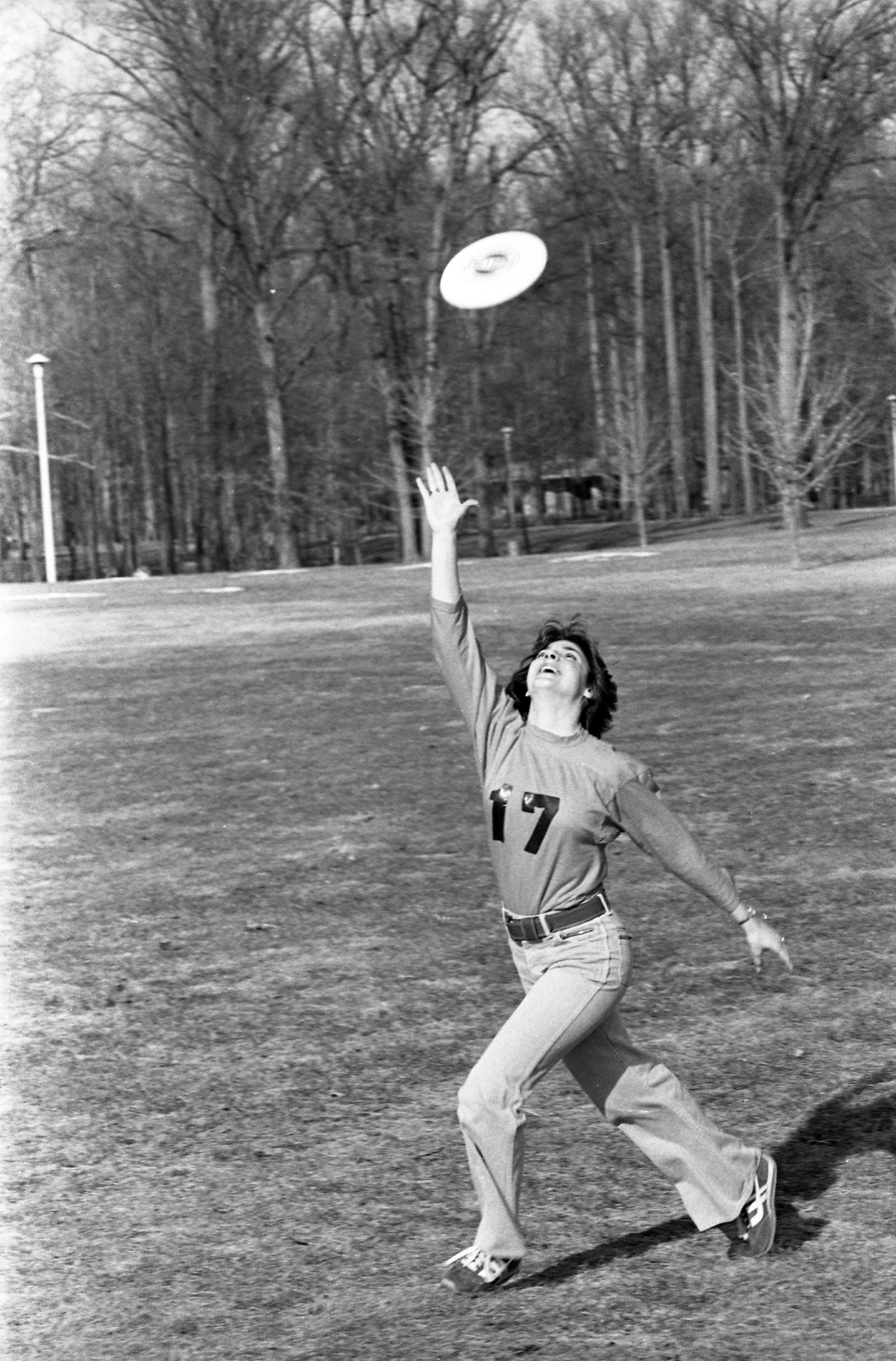 Girl (high school or college aged) reaching up to catch a Frisbee. This might be Wesselman Park at 551 N. Boeke Rd.