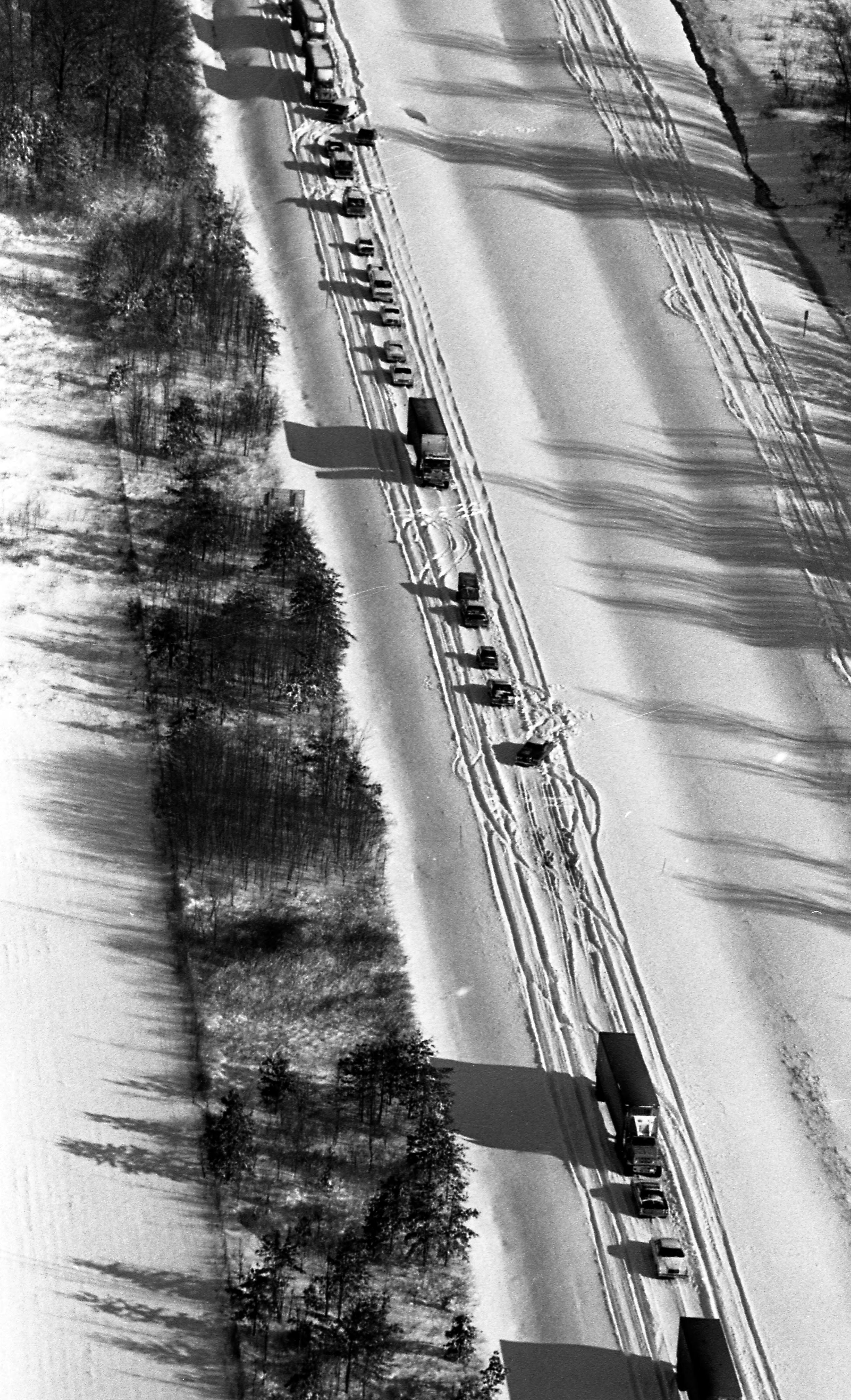 This photograph was taken at the same time as one that appeared in the February 26, 1979 edition of the Evansville Press. The caption read,""Stranded vehicles lined Interstate 57 south of Benton, Ill., after up to 2 feet of snow made travel in Southern Illinois impossible. More than 3,000 travelers are estimated to have sought shelter in churches, schools, and civic centers because all motels were filled. Volunteers in four-wheel-drive vehicles and snowmobiles rescued many of the motorists from I-57 and I-24 in Southern Illinois." The storm was on February 25, 1979.