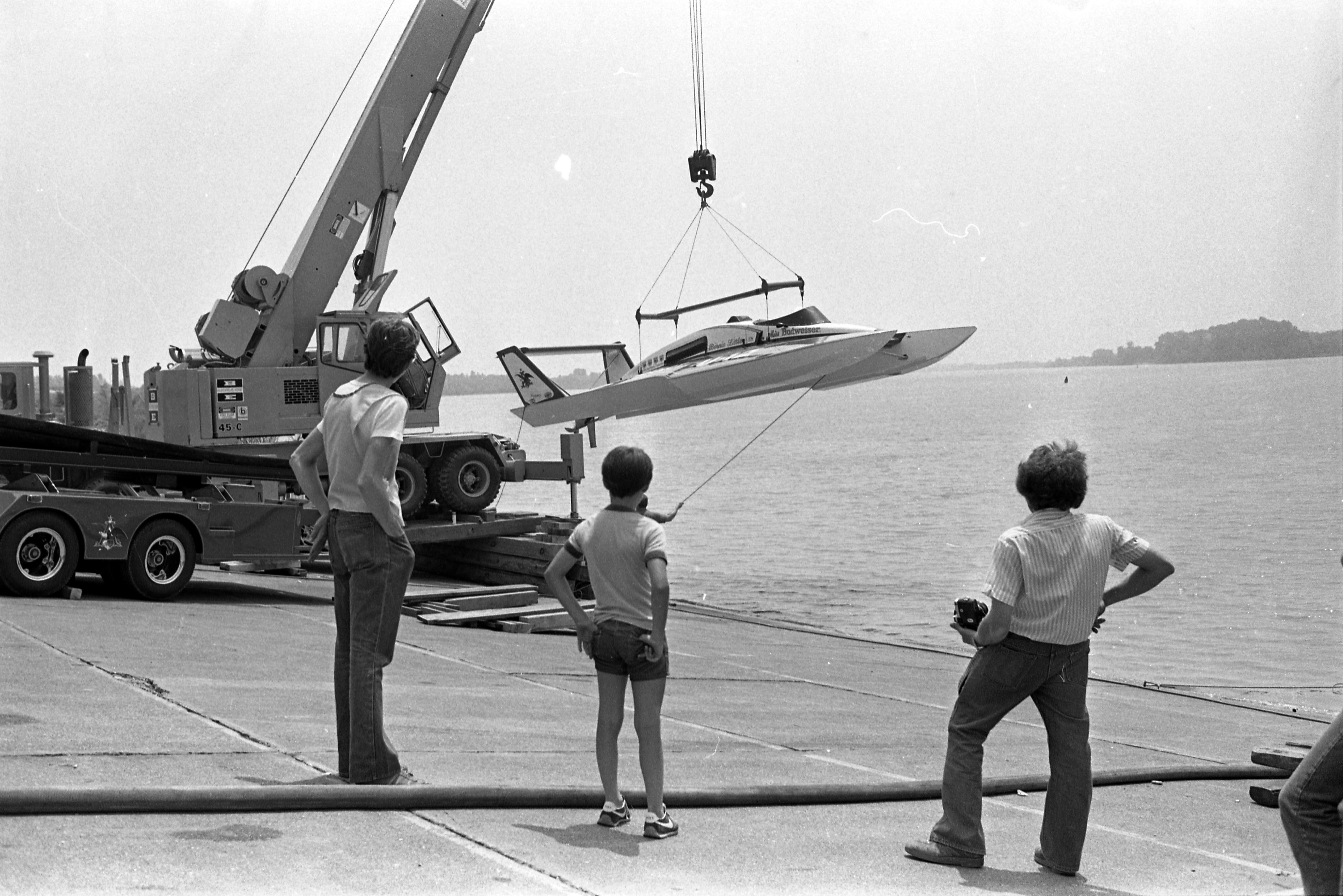 Thunder on the Ohio hydroplane races. Atlas Van Lines boat being lowered into the water.