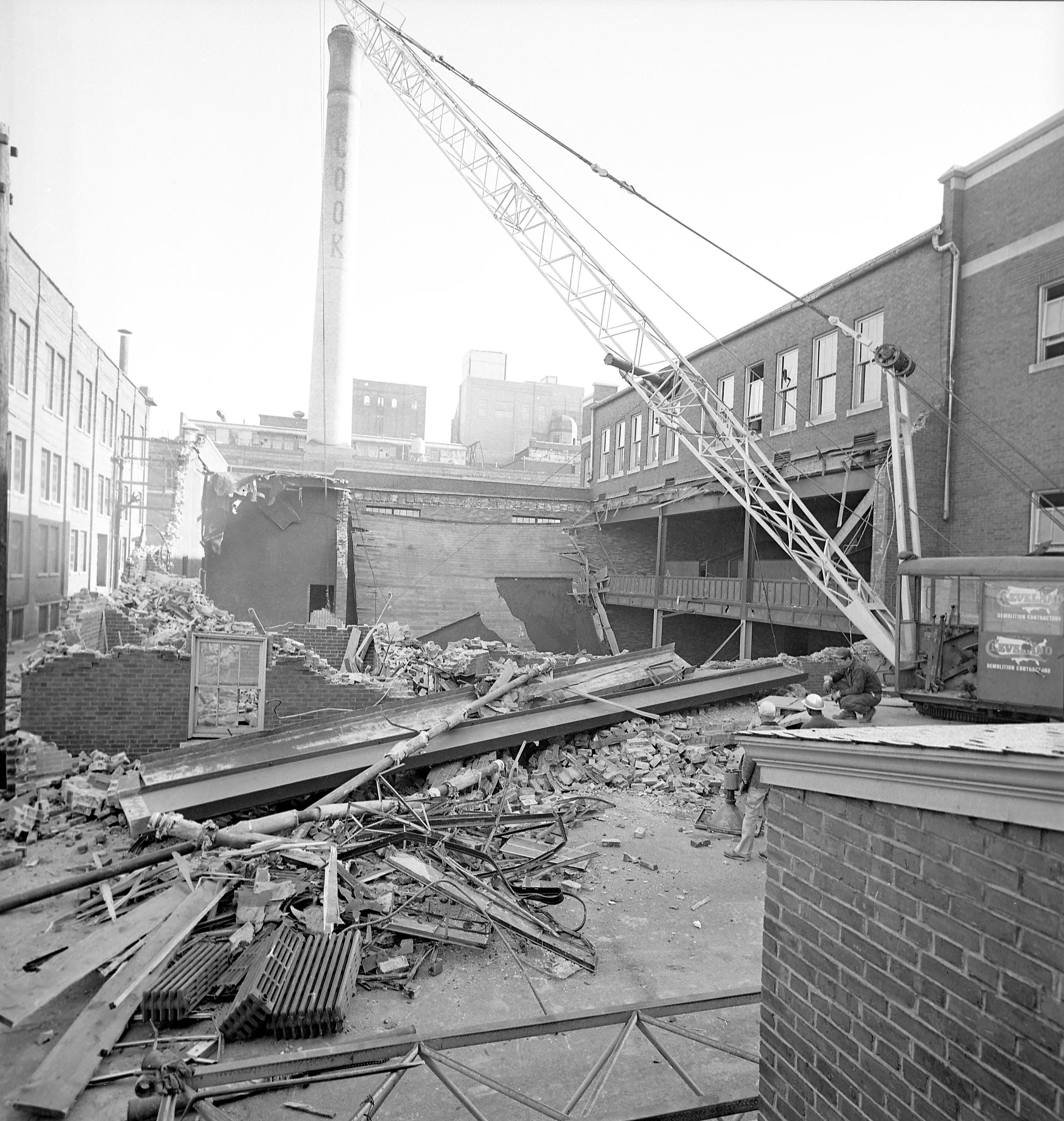 Assumption Church at 119 NW7th St. was built in 1872 and in 1944 became the cathedral for the newly formed Diocese of Evansville. The church was sold to the city in 1965 and the last mass heard January 17, 1965. The building was razed in May 1965 to make way for the new Civic Center complex. The Winfield K. Denton Federal Building now stands on this site. Here demolition is under way.