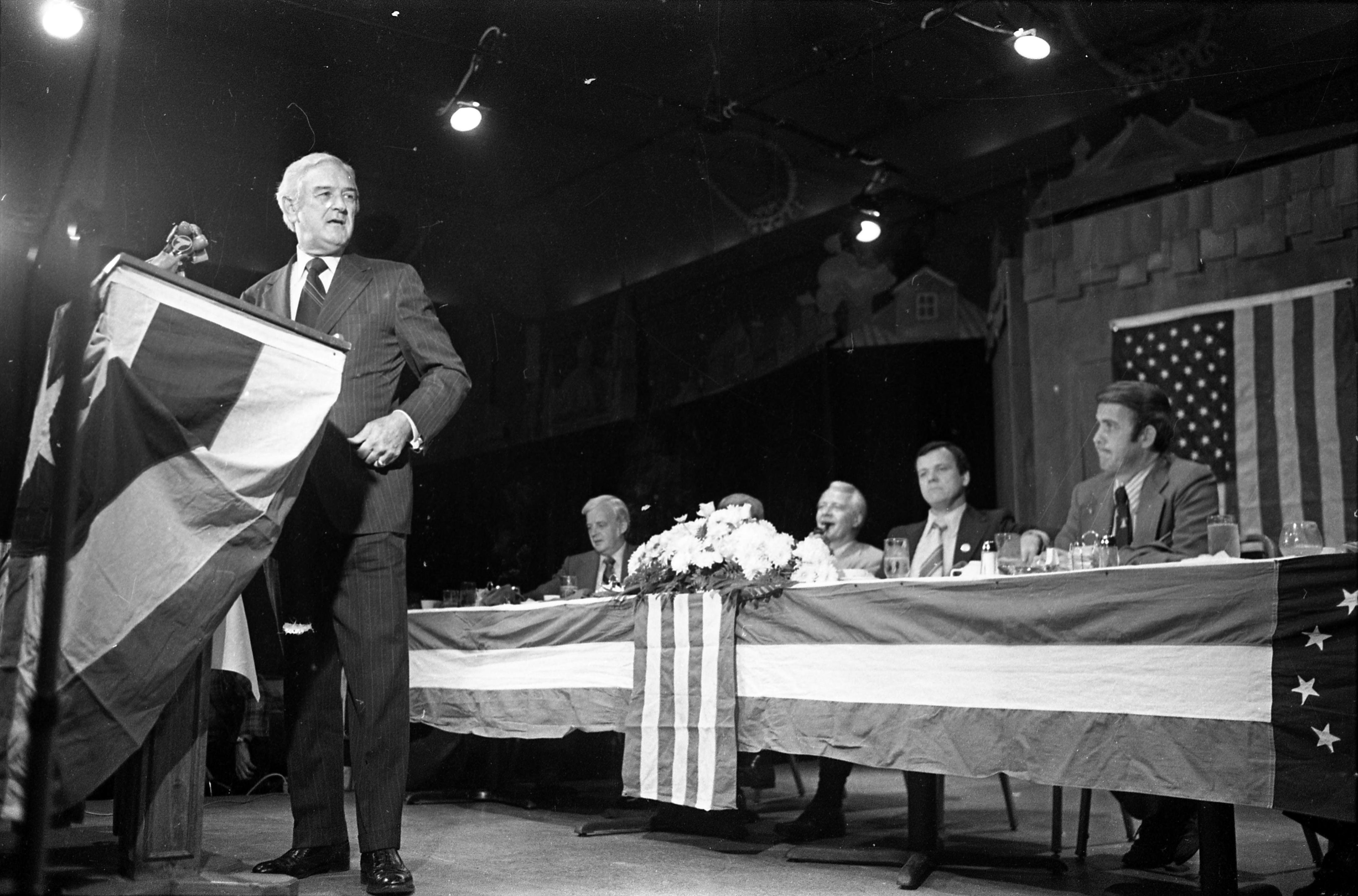 Former Secretary of the Treasury John Connally spoke at a fundraiser for U.S. Representative (Indiana, 8th district) candidate, Belden Bell. The luncheon was held at the Upstage Dinner Theatre, 100 SE 1st St. Of the 4 men behind him, the white-haired man behind the flowers is Indiana Lt. Gov. Robert Orr, and farthest right is Belden Bell, and on the far left is Don Cox, leader of Vanderburgh County Republicans.