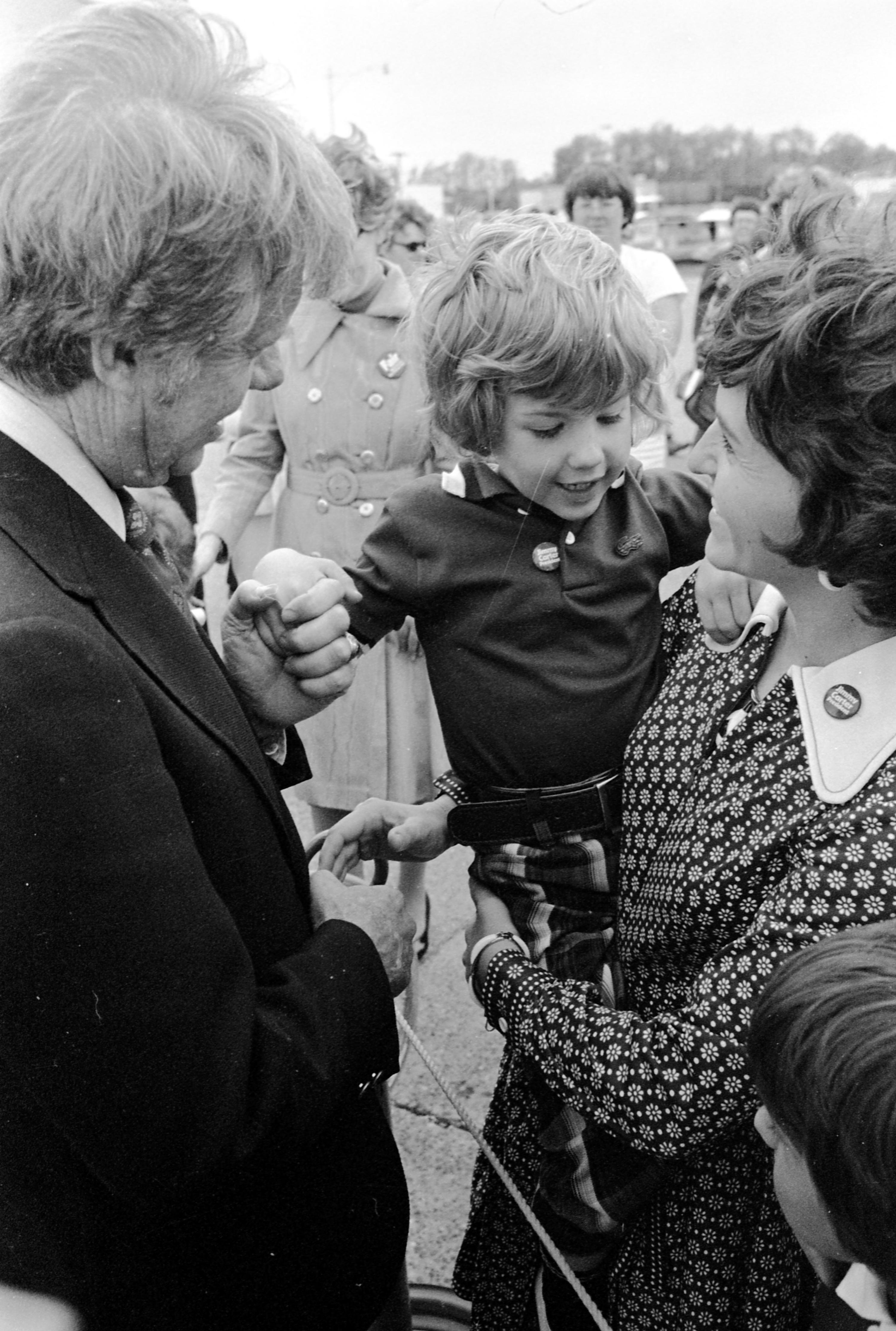 Jimmy Carter on the U.S. presidential campaign trail, at Evansville Dress Regional Airport on U.S. Hwy. 41 North, holding the hand of a young boy in his mother's arms