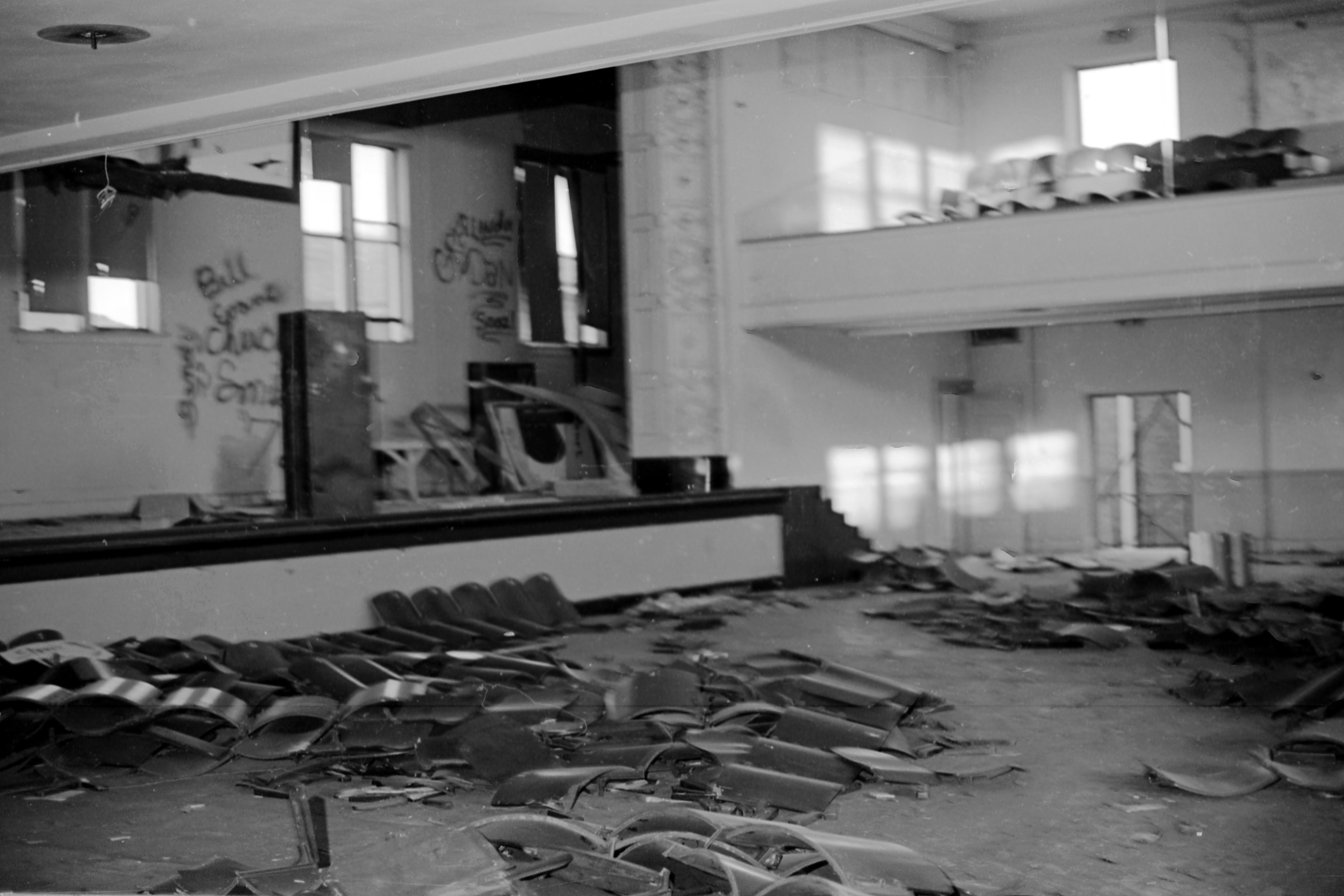 Auditorium at Central High School, 203 W. 6th St., partially demolished and vandalized. Old Central High School was the oldest free public high school in continuous operation west of the Allegheny Mountains. The school was founded in 1854 and moved into this permanent location in 1868; by the time it closed in 1971 and was razed in 1973, it covered a city block. The school still exists, now on First Ave.