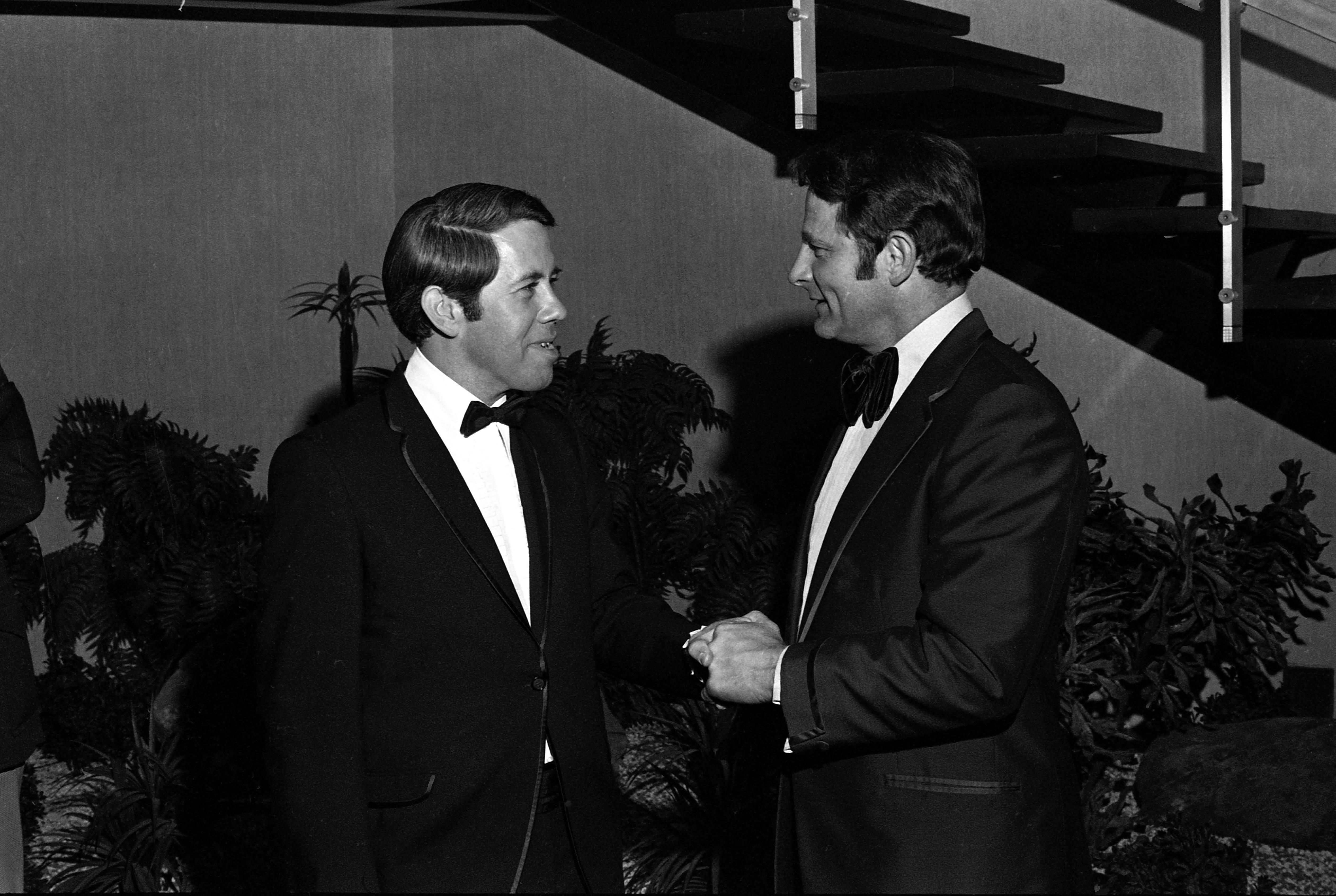 Richard Lugar and Birch Bayh shaking hands at event called " The Devil Made Me Do It." The venue appears to be the Civic Center/Vanderburgh County Auditorium at 715 Locust St. (This facility no longer exists.) At the time of this photograph, Richard Lugar was the Republic mayor of Indianapolis and Birch Bayh was the Democratic U.S. Senator from Indiana.