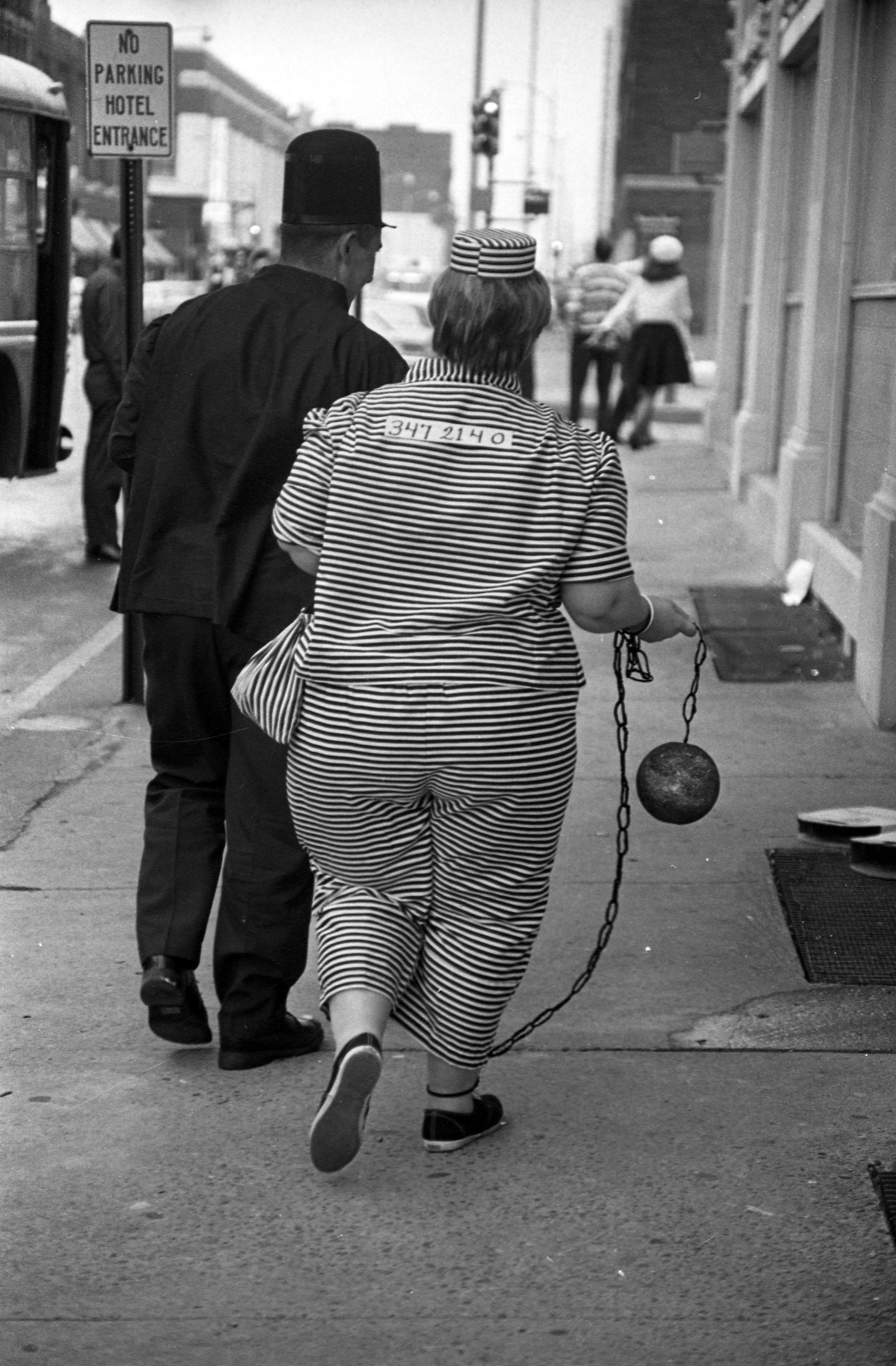 Woman dressed as prisoner and carrying her ball and chain, with man dressed as guards ") on the street by a private bus, somewhere near the Hotel McCurdy (101-11 SE 1st St.) Other pictures in this series (see MSS 228-0908-0913, 0925-0928) make it clear that this is a stunt/gag/costume event of some sort.