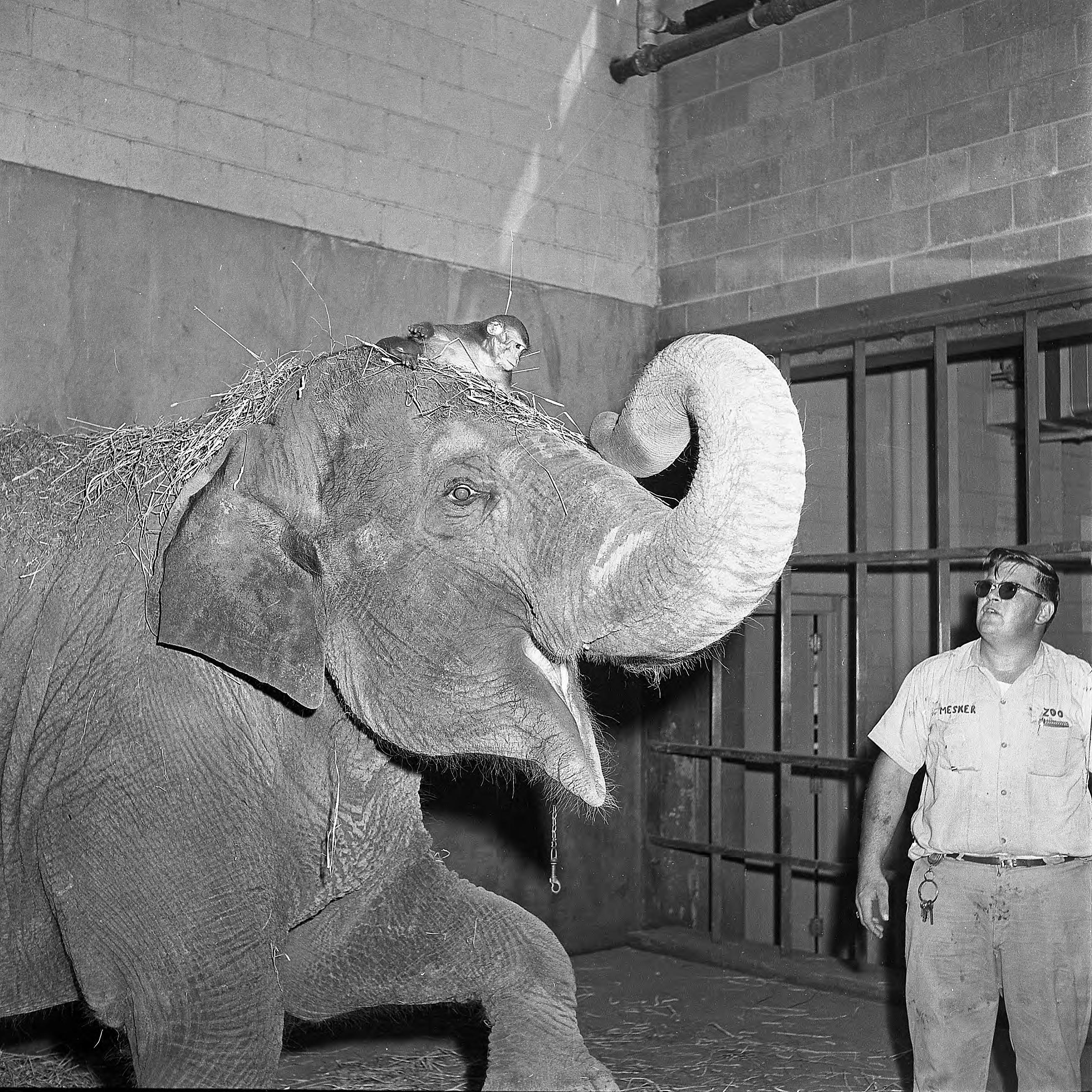 Monkey sitting on head of Bunny the elephant at Mesker Park Zoo on Bement Ave.