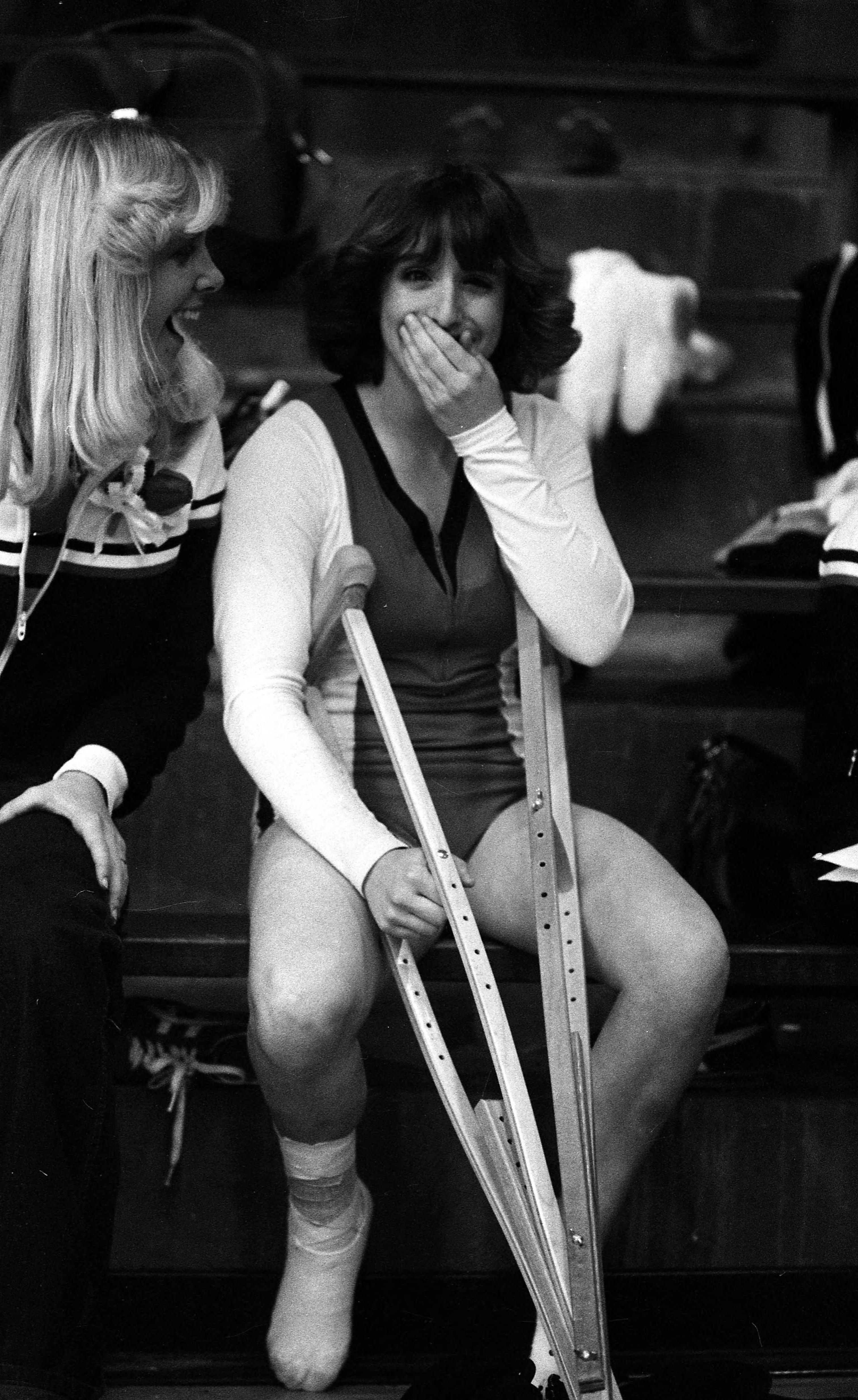 Arlyne Siegel, Harrison High School gymnast, sitting on the sidelines with a sprained ankle, at the Evansville sectionals at North High School at 2319 Stringtown Rd. The school still exists, but not at this location.