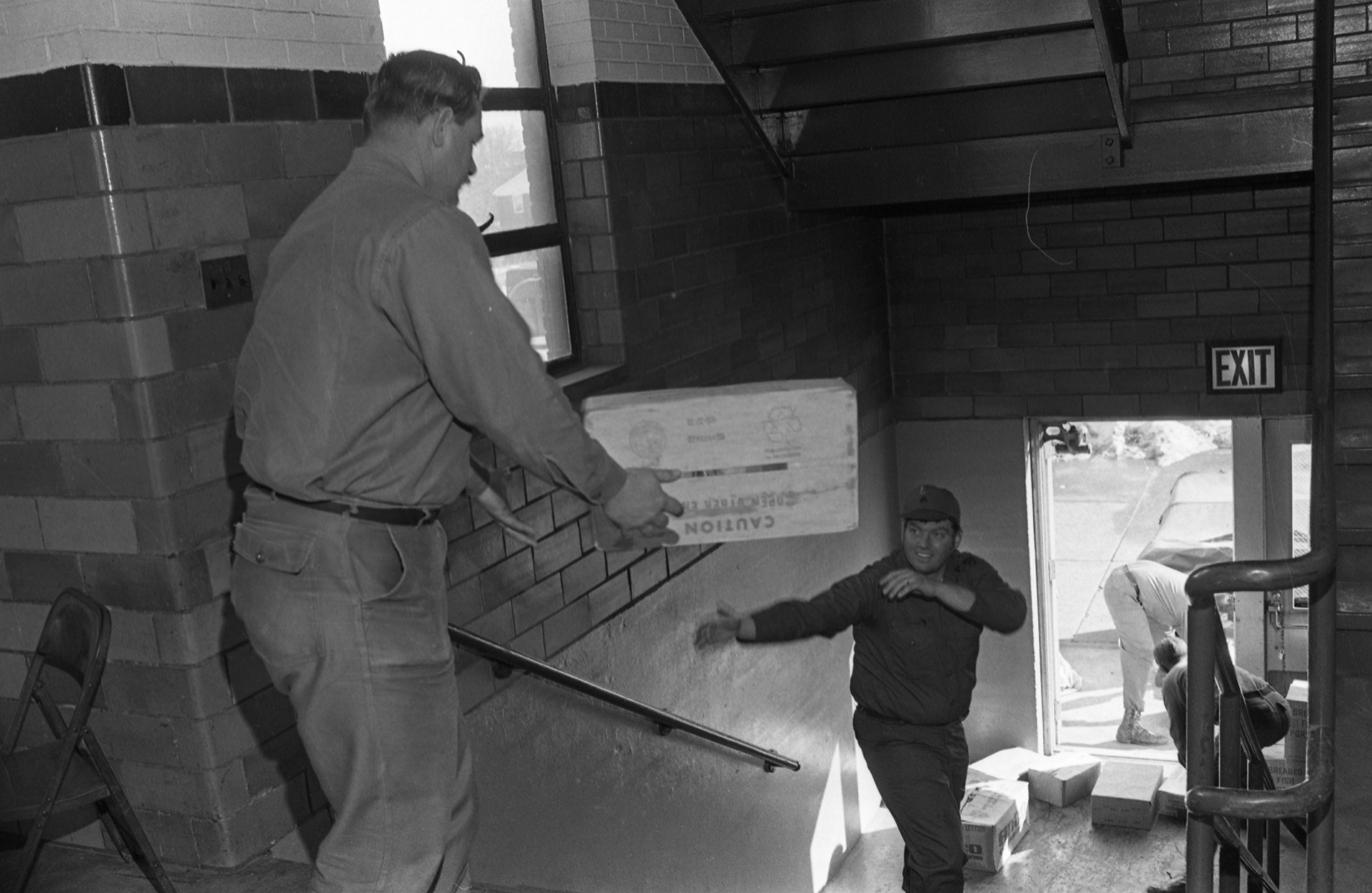 In December 1977 the UMWA (United Mine Workers of America) began a 110 day strike nationally. Violence ensued in many parts of the country, and on February 14, 1978 Indiana governor Otis Bowen ordered the Indiana National Guard to assist the state police in escorting coal convoys in delivering coal to Indiana utilities. Here two men pass a box of supplies down a staircase---this is possibly related to the presence of the Indiana National Guard.