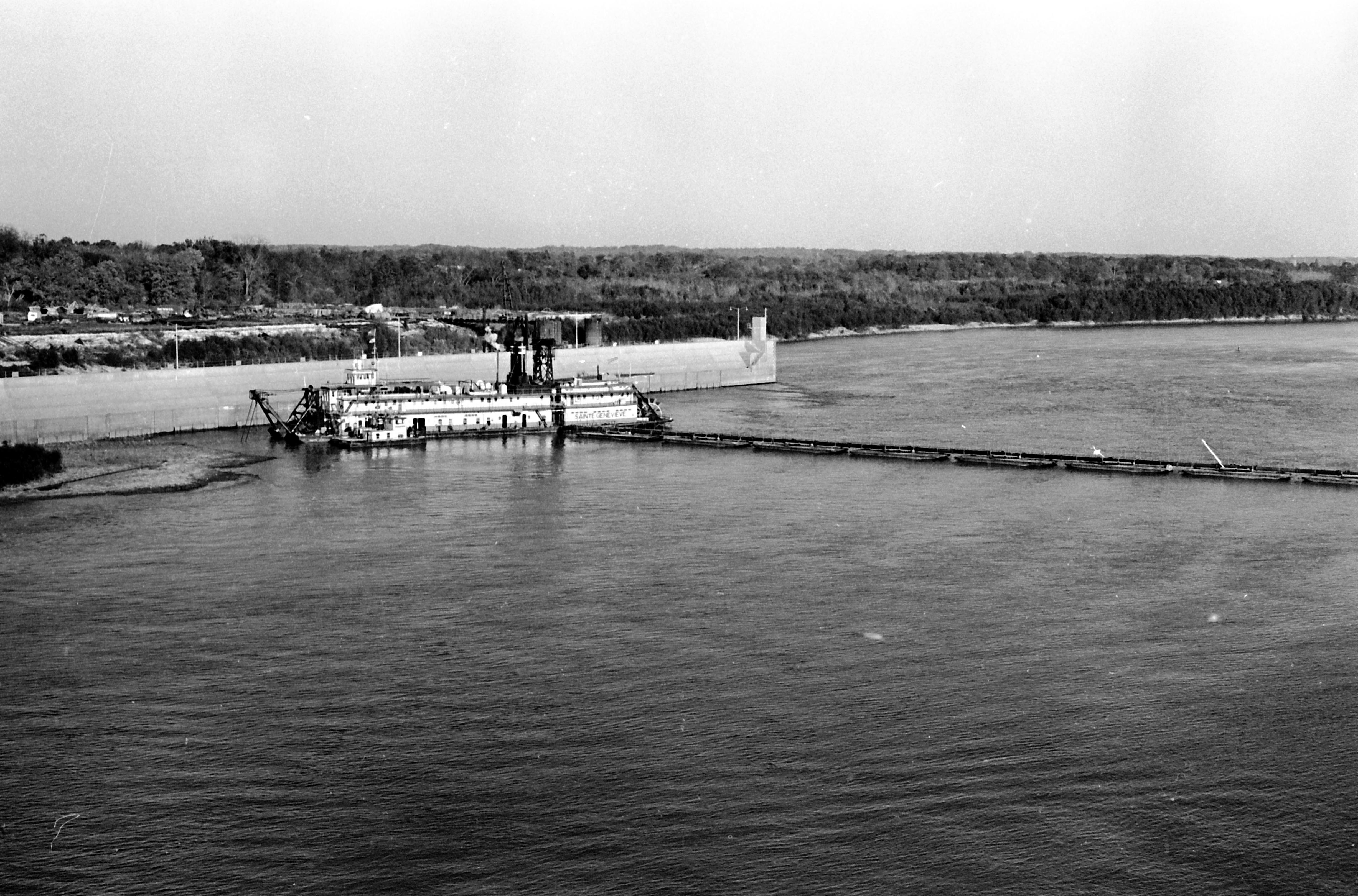 Construction of dam at Newburgh. In this photo, you can see a paddle-wheeler, the Sainte Genevieve, crossing over the dam. According to the U.S. Army Corps of Engineers, construction on this dam began in June 1970 and was completed in 1975. The locks were built first, beginning in June 1966 and placed into operation in December 1969. Statistics on the dam: Type: Concrete fixed weir with tainter gate; Length: 2,275'; Upper pool: 358'; Lower pool: 342'; Number of gates: 9; Height of gates: 32'; Width of gates: 110'