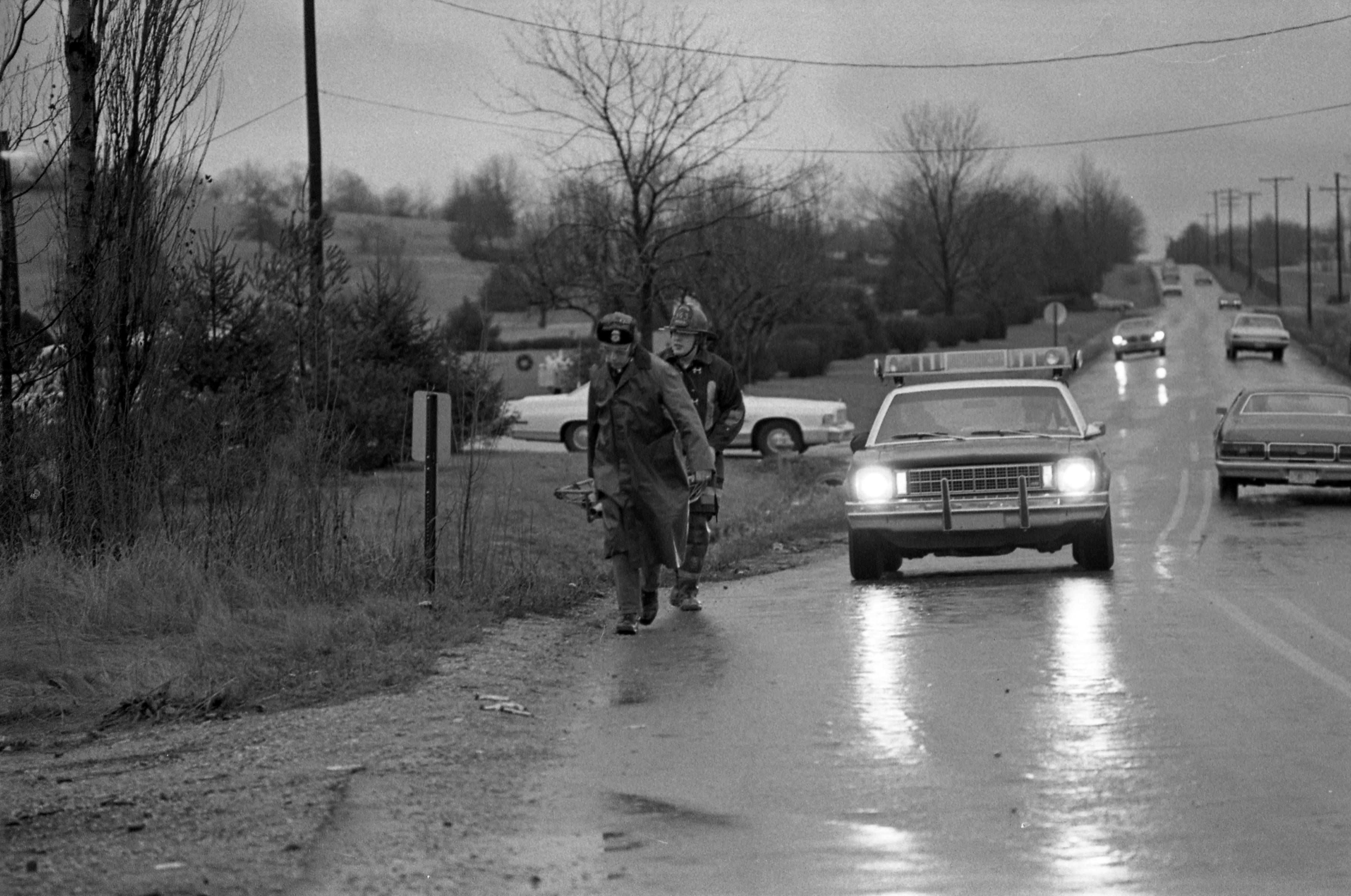 On December 13, 1977, the University of Evansville men's basketball team, coaches/staff, and fans, boarded a chartered DC-3 plane for a game in Nashville, TN against Middle Tennessee State University the next day. Ninety seconds after take-off the plane crashed, killing 29, including the basketball team, head coach, 3 student managers, athletic business manager, UE comptroller, sports information director, a popular radio announcer, and 2 fans. The crash was in a remote, hilly area with few access roads, so here a fireman and a policeman carry a stretcher up the road.