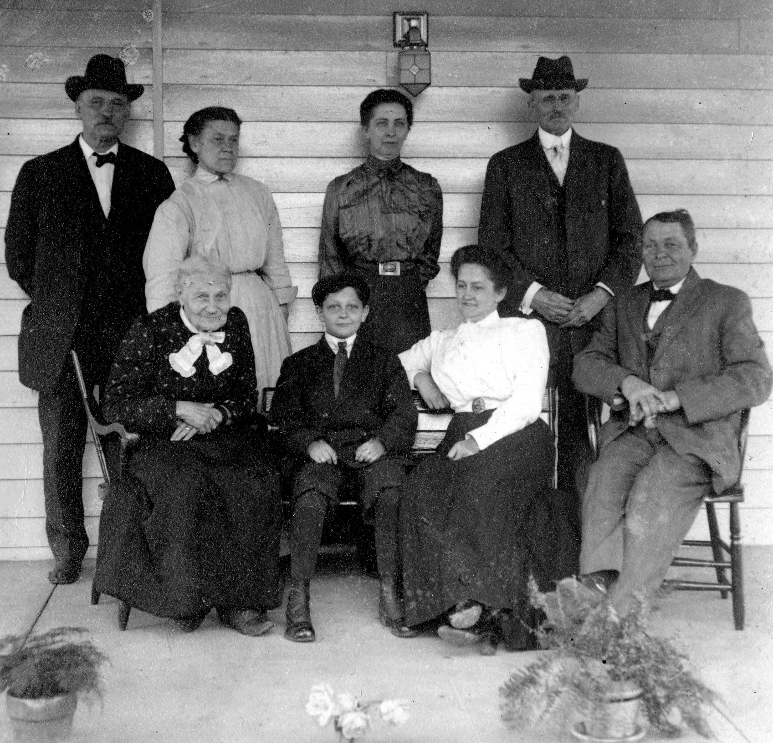 From left, in rear: Clarence Lichtenberger (1847-1913), Mary Emily Fauntleroy (1858-1954), Maud Miller Fauntleroy (1869-1934), and Will Lichtenberger (1849-1924). Seated, from left: Rachel M. Homer Fauntleroy (1830-1914)" and Dr. Wilson family. The Fauntleroy relationships in this picture are thus: Rachel is the mother of Mary Emily, and the mother-in-law of Maud, who was married to Rachel's son, Homer. The Lichtenbergers pictured are believed to be brothers. NOTE: the dates are taken from gravestones and are appropriate to the people pictured here, but cannot be considered positive identification.