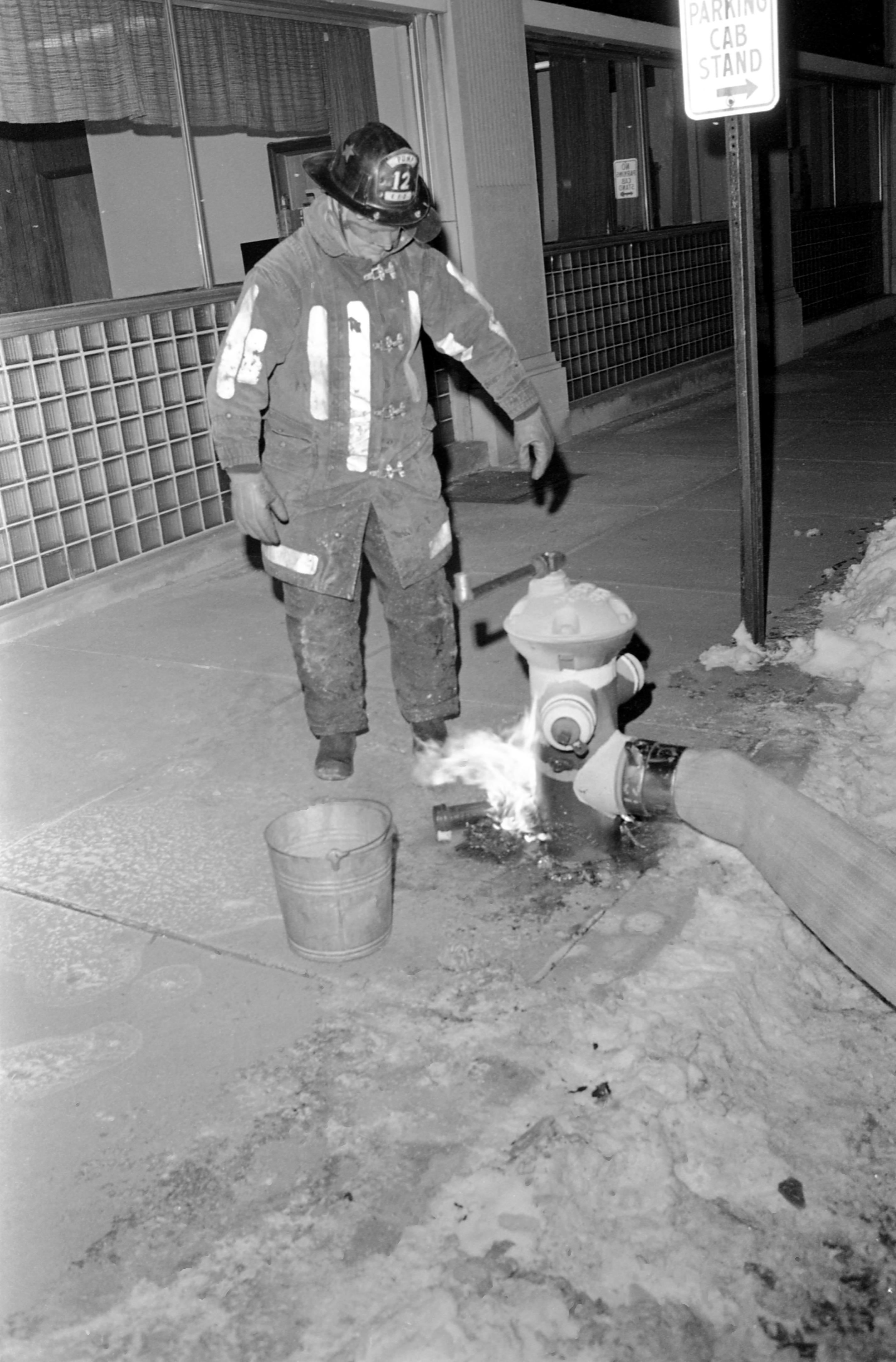 Fireman looks at a fire hydrant at the fire at Upstage Dinner Theatre at 100 SE 1st St. The temperature was 21 degrees below zero that night, so firefighters had to light fires at the base of the hydrant to keep the water from freezing, thus compounding the difficulty of fighting the fire.