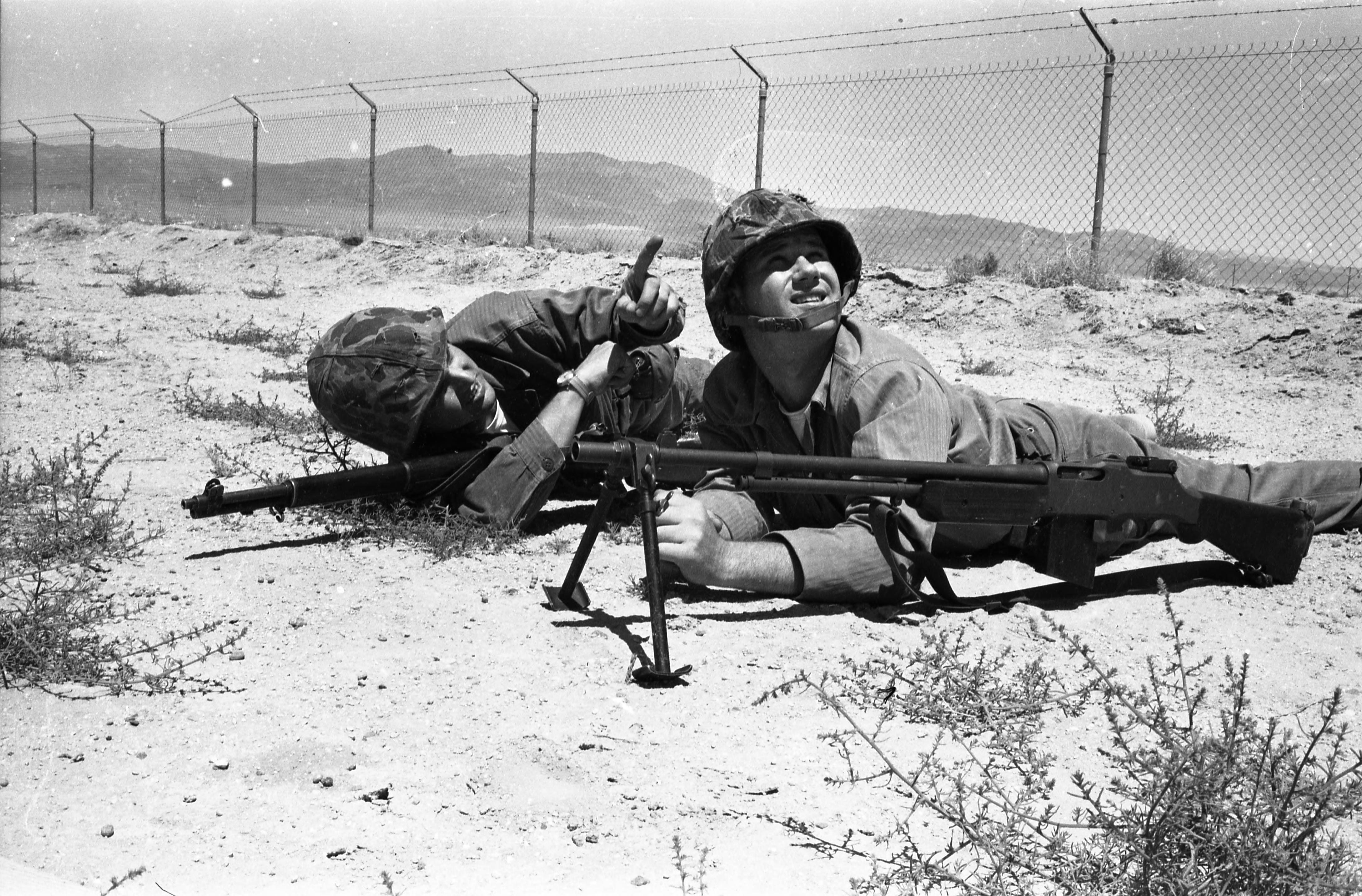Evansville's 17th Rifle Co. Marine Reserves attended summer training at Hawthorne Naval Ammunition Depot (now called Hawthorne Army Depot). With over 147,000 acres/226 square miles, it is the world's largest depot and a frequent site for desert training. This photograph appeared in the July 4, 1959 edition of the Evansville Courier with this caption:""Two southern Indiana Marines at summer camp in Hawthorne, Nev. take a break from training to watch a jet swish across the sky. They are Pfc. Jim Huth, Chandler (left) and Pfc. Don Rich, 2031 Cass Avenue. Both are members of Evansville's 17th Rifle Company, Marine Reserves."