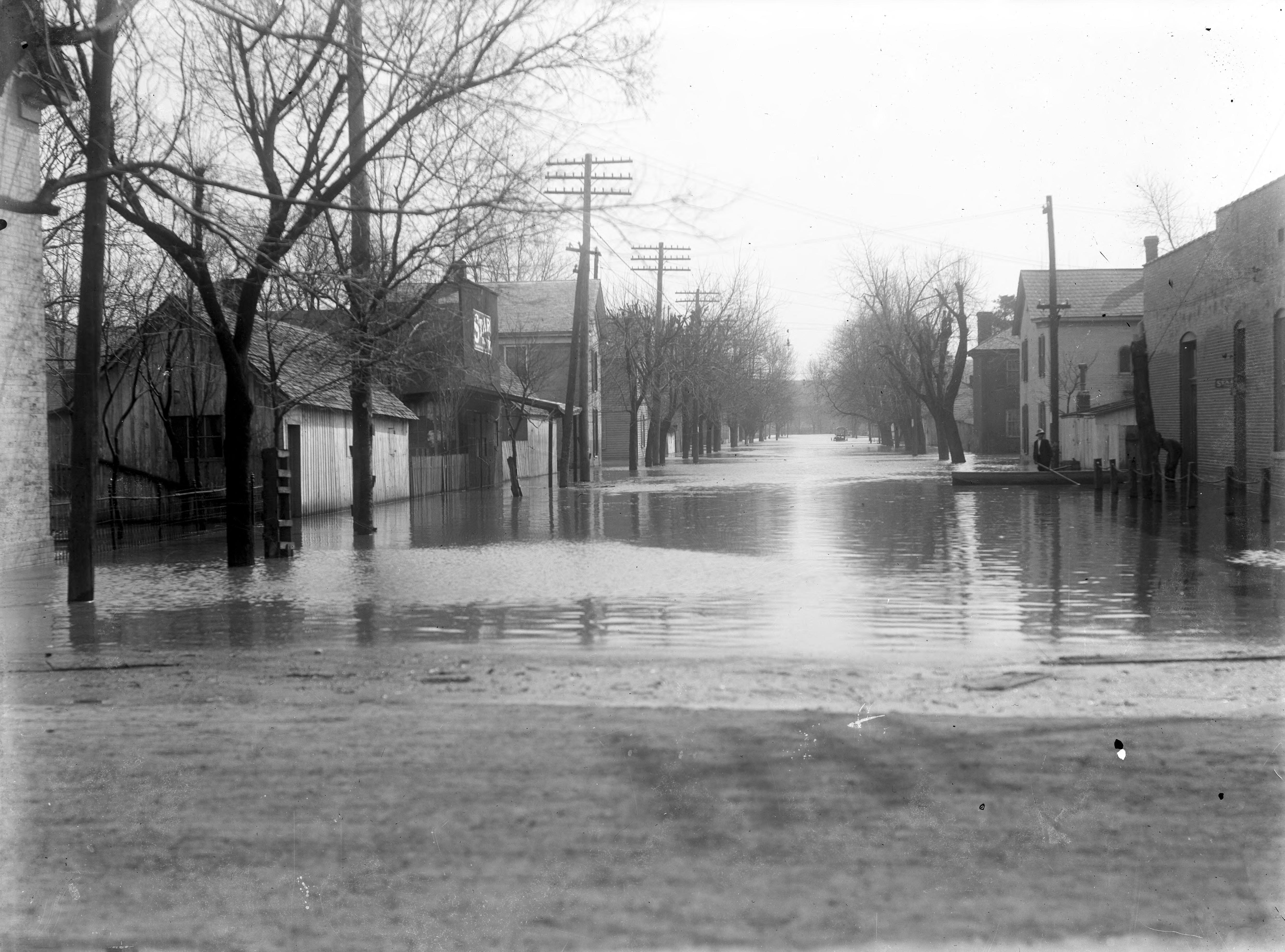 Wiley Corner in floodwater. �In a period of just two days (March 24th and March 25th [1913]) Indiana, Kentucky, Ohio, Pennsylvania and New York experienced tornadoes and the equivalent of two to three months worth of rain. A late spring thaw left the ground saturated, or still mostly frozen. As a result, massive flooding began to occur and impacted fifteen states along the Ohio and Mississippi Rivers. In Indiana, communities along the Wabash, White, and Ohio Rivers were most affected by the flooding, which also extended to hundreds of smaller tributaries throughout the state. The following National Weather Service Report was made by Acting Section Director C. E. Norquest: The flood of March, 1913, is without parallel in the history of Indiana. Water states reached were from 2 to 8 feet higher than those recorded in any previous flood; the loss of life and property was unprecedented; thousands were driven from their homes, fleeing for their lives; transportation lines were helpless through loss of track and bridges; telephone and telegraph lines were crippled; communities were cut off from communication with the outside world for from 24 to 48 hours; cities were deprived of light and power by the flooding of power plants; isolated towns were threatened with famine; and for a period of 3 days or more the great commercial enterprises of the State were at a standstill. � The other major river that experienced unprecedented flooding in Indiana was the Wabash River. The Wabash starts in Fort Recovery, Ohio, and then meanders through the state of Indiana for 445 miles. It drains approximately sixty of the state�s ninety-two counties, which cover over 33,000 square miles. Cities in the river�s path include Bluffton, Huntington, Wabash, Peru, Logansport, Lafayette, Attica, Terre Haute, Vincennes, and New Harmony. Though the Wabash typically averages 231 feet wide, the 1913 flood left it almost seven miles wide.� (http://www.in.gov/dnr/historic/files/hp-1913_flood.pdf).