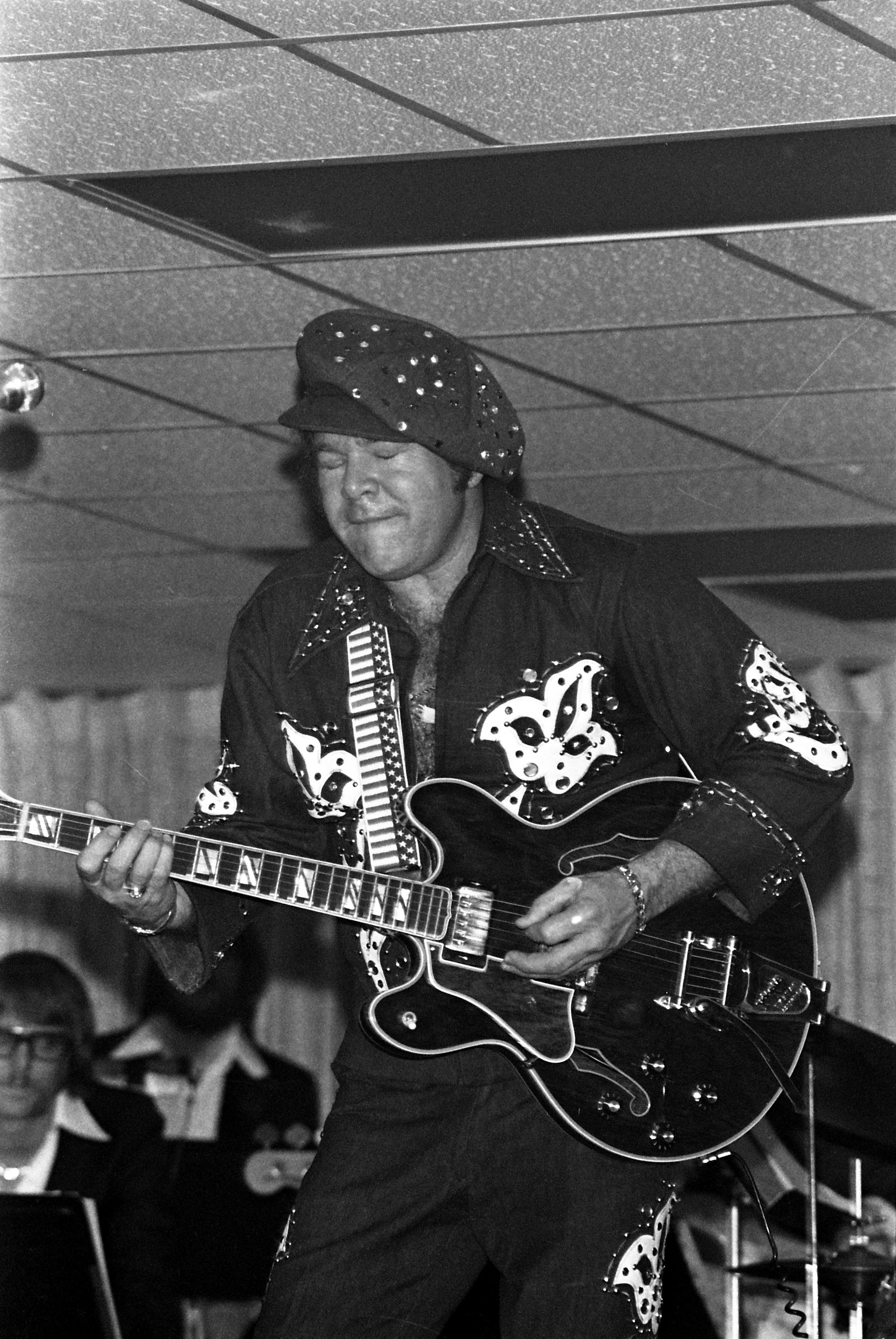 Roy Clark in concert, playing his guitar, with other members of his band barely visible. He played 3 nights at the Executive Inn (600 Walnut St."
