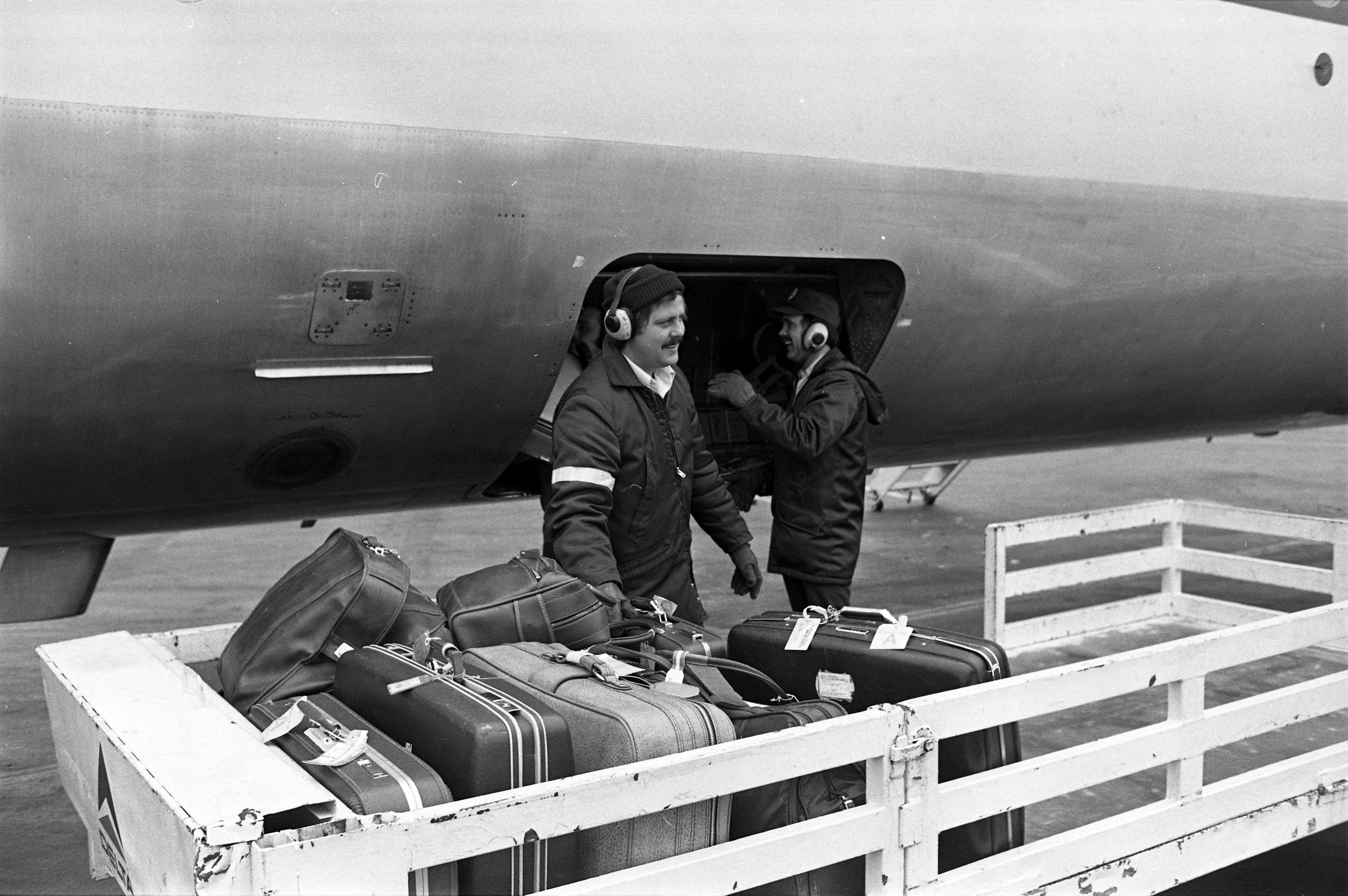 Delta Airlines baggage handlers, loading suitcases onto a plane, at Evansville Dress Regional Airport on U.S. Hwy. 41 North