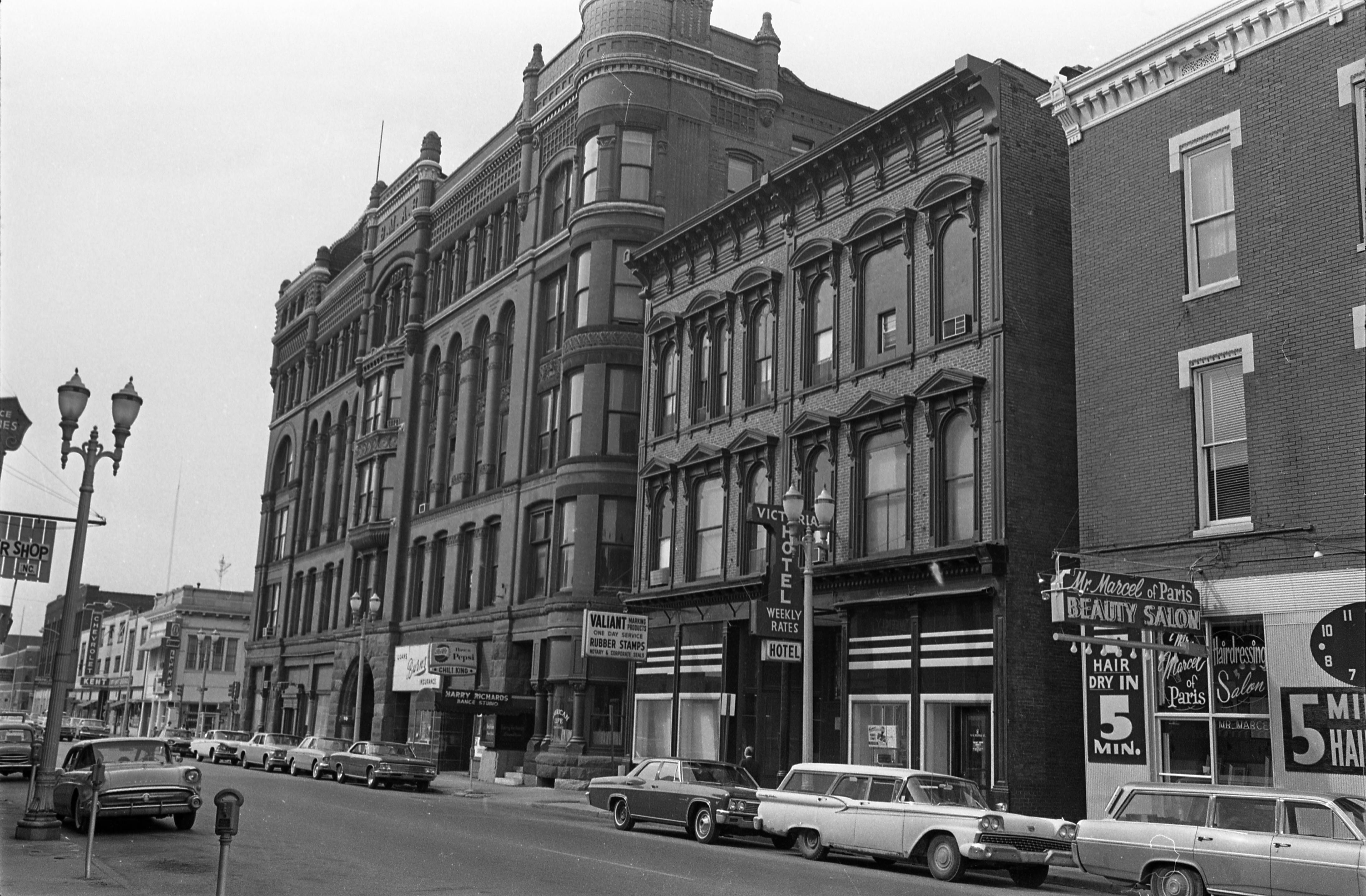 NW 2nd St., between Main St., looking toward Sycamore St. Identifiable businesses are Mr. Marcel of Paris Beauty Shop at 5 NW 2nd St., Valiant Marking Products Inc. at 9 NW 2nd St., Victoria Hotel at 9 1/2 NW 2nd St., American Life and Accident Insurance Co. of Kentucky and Harry Richards Dance Studio, both at 13 NW 2nd St., Chili King restaurant at 15 NW 2nd St., and P.W. Burns and Son Agency (insurance) at 17 NW 2nd St. The Grein building is on the corner with Sycamore St.