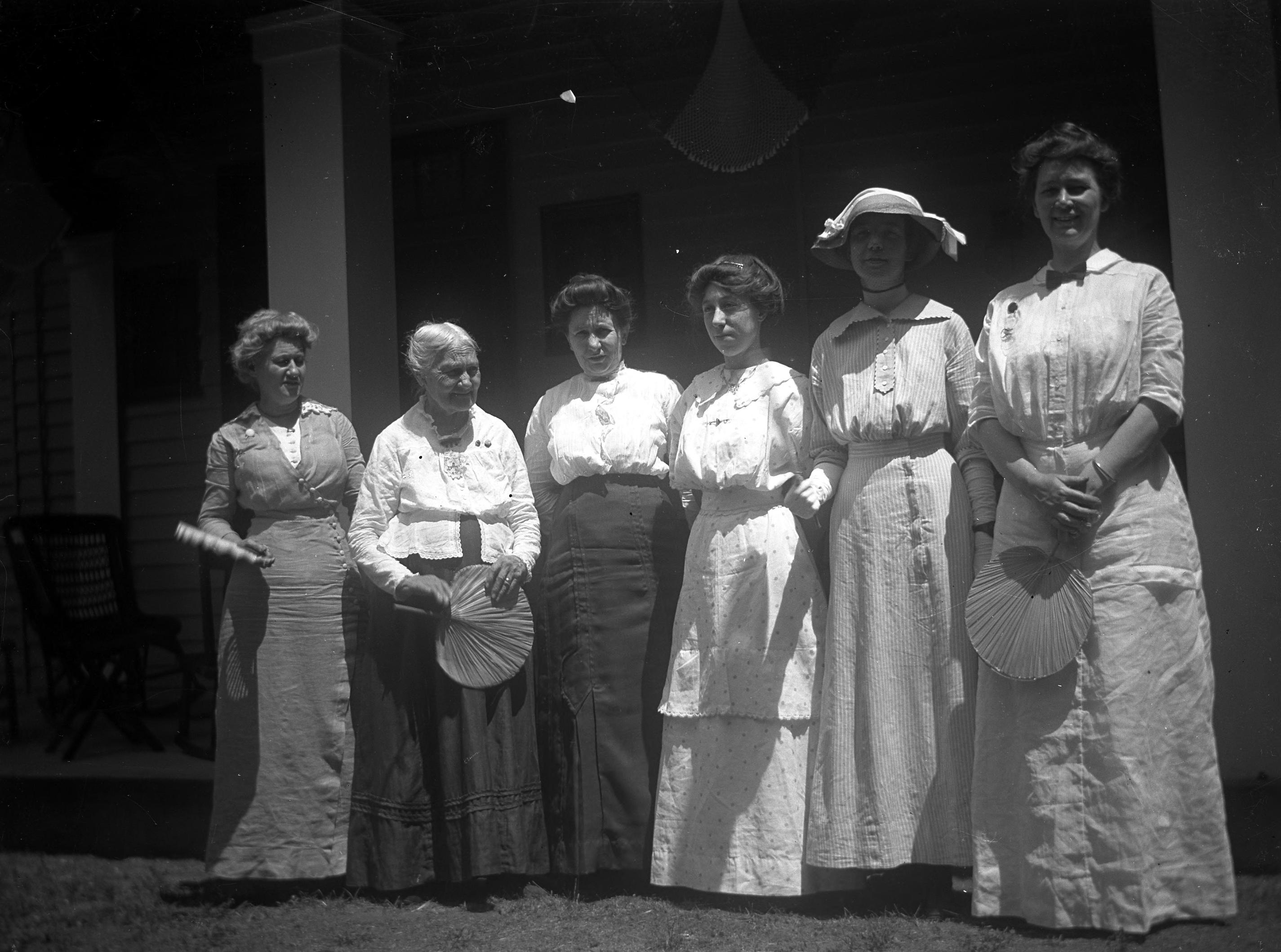 From left: Millie Cox, Rachel Fauntleroy, Ethel Preaus Broadwell, Bessie Broadwell Brown, Miss Ziliak, and one unidentified woman standing in front of the porch the old Fauntleroy home (presumably the one at 411 West St.) There is a Rachel M. Homer Fauntleroy (1830-1914) buried in Maple Hill Cemetery, who is the mother of the Homer Fauntleroy and mother-in-law of the Maud Miller Fauntleroy seen elsewhere in this photographic collection. Her age is appropriate for the woman in this photograph, but this cannot be regarded as positive identification.